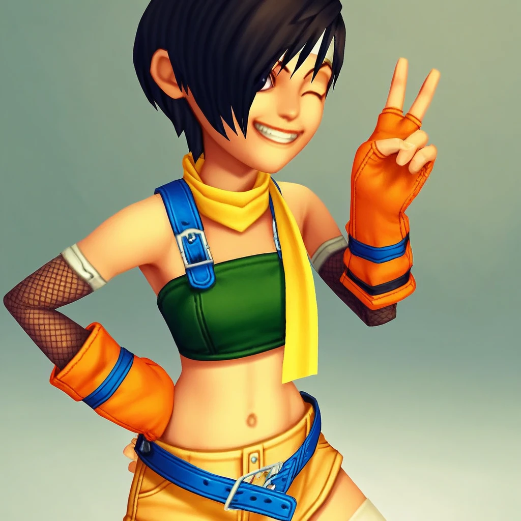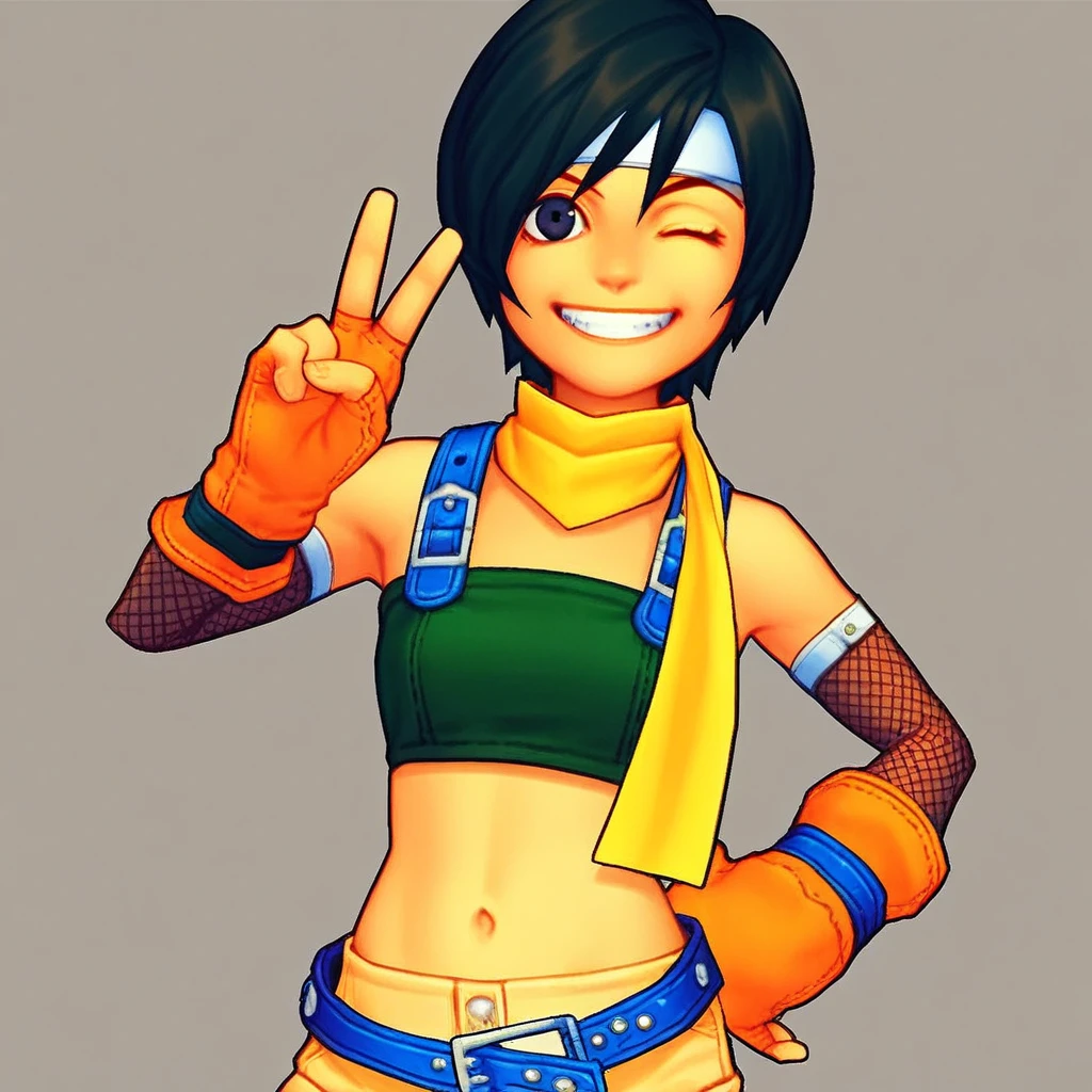 yellow scarf, blue straps, green bandeau, navel, fishnet elbow warmers, orange gloves, fingerless gloves, shorts, loose belt, blue belt, white thighhighs