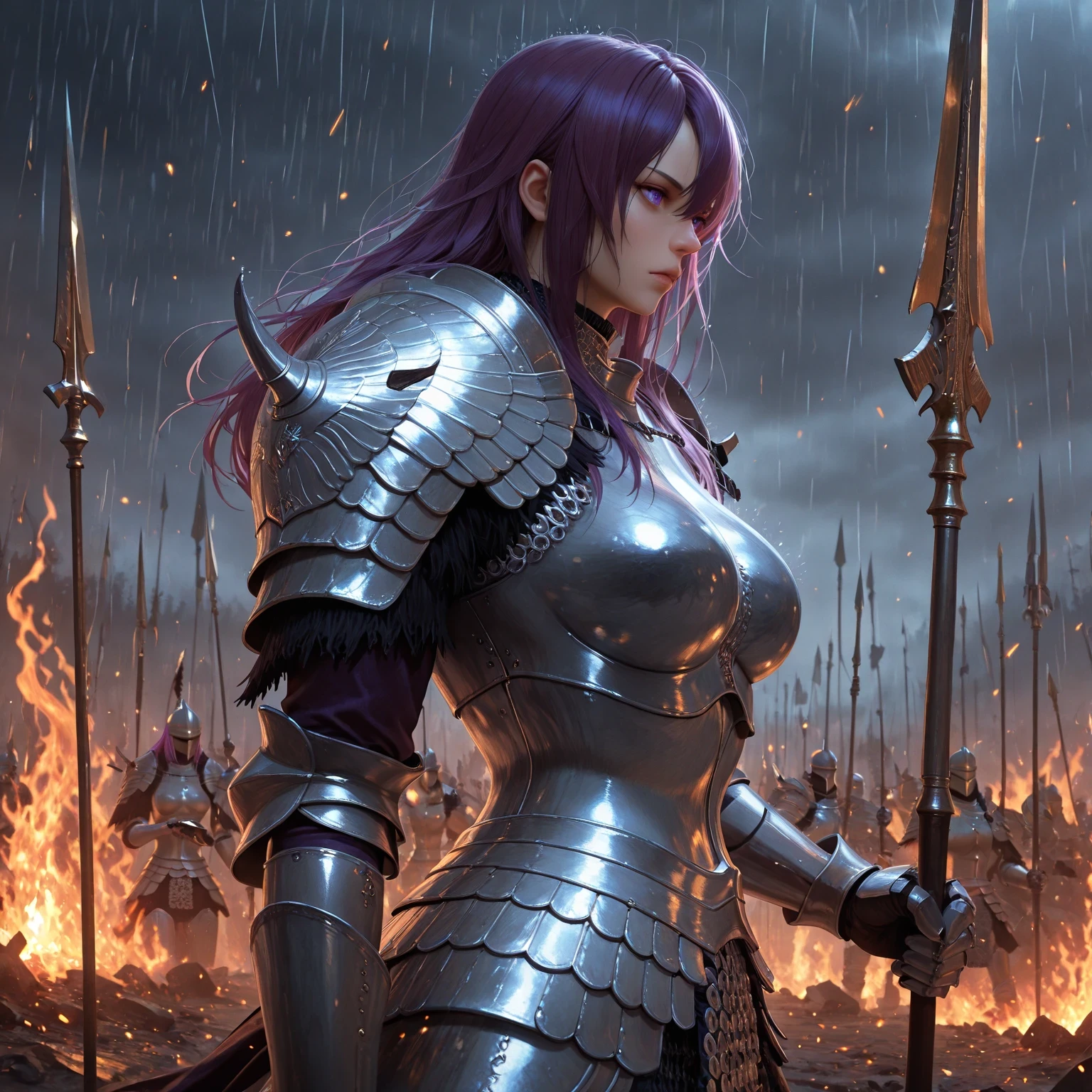 Appearance prompts: long hair, purple hair, purple eyes, hair between eyes, lips