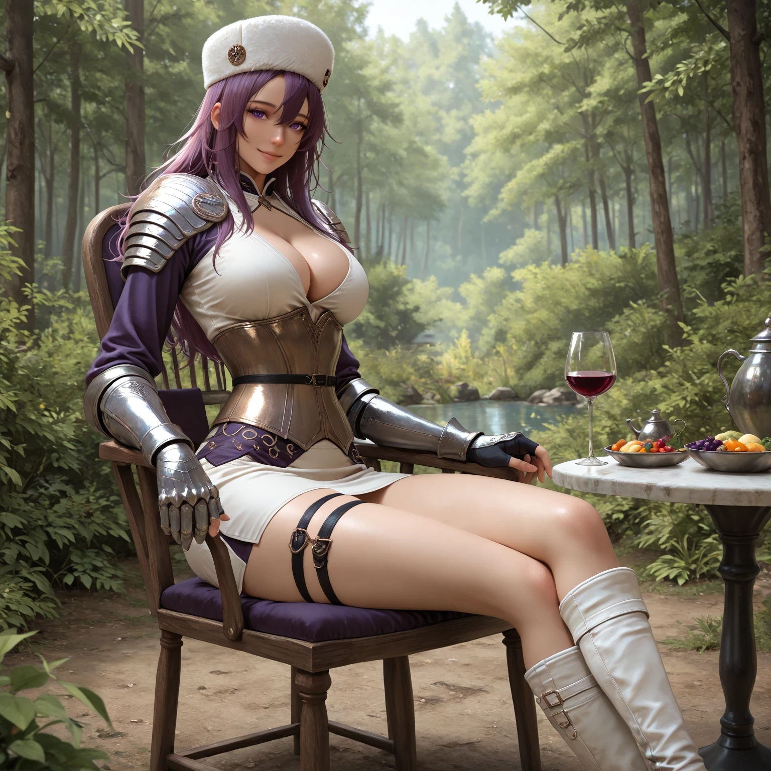 Outfit 2 (officer) prompts: skirt, high heels, knee boots, gloves, hat, cleavage, boots, belt, armor, thigh strap, cleavage cutout