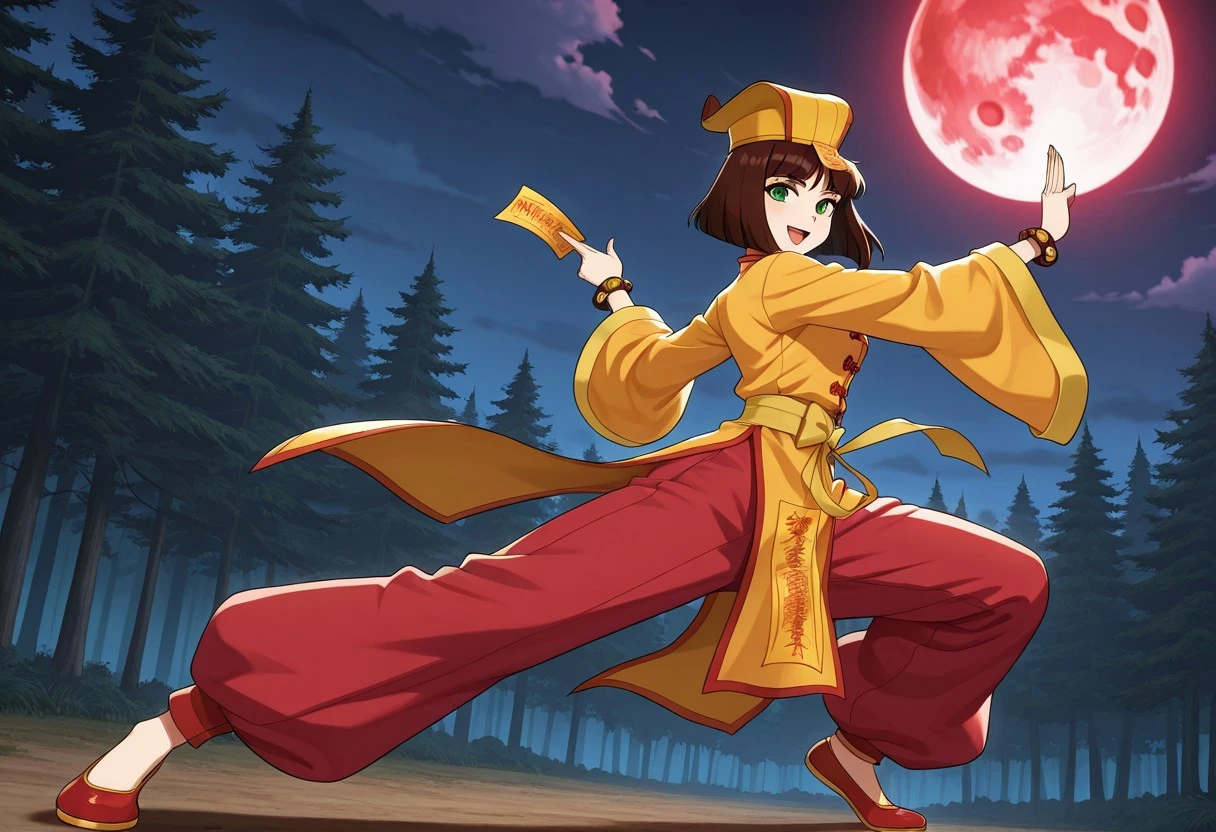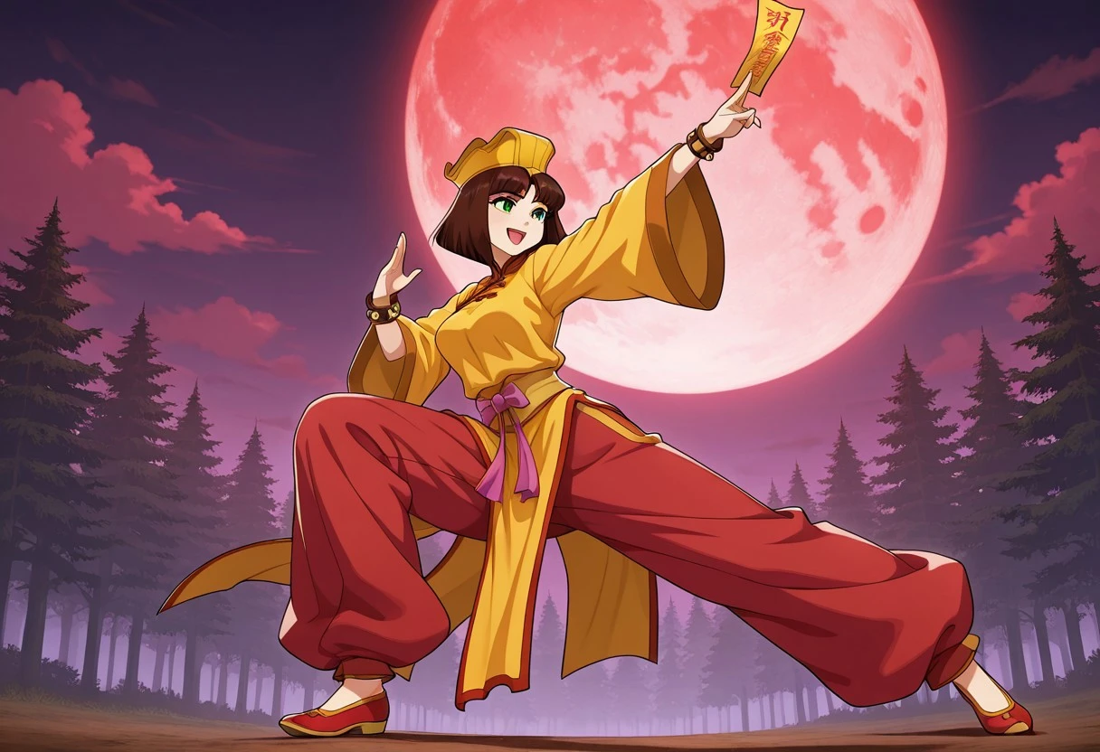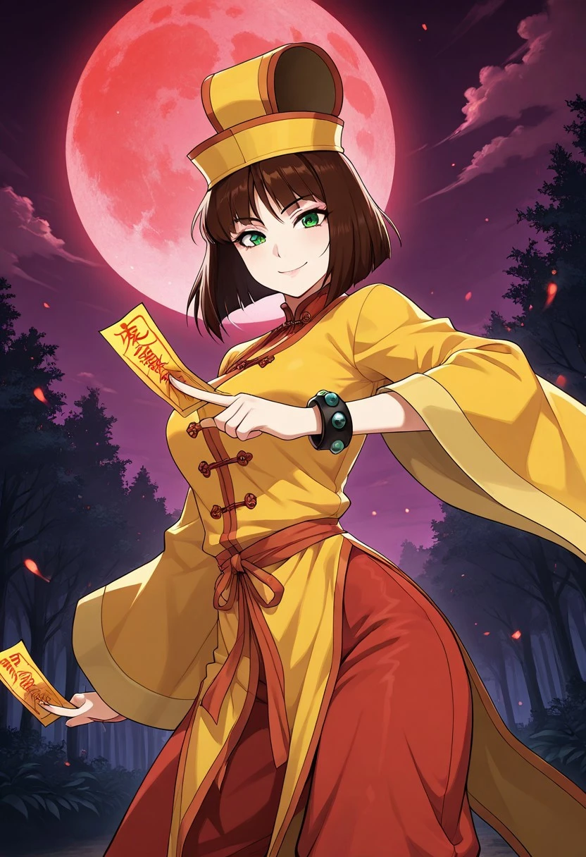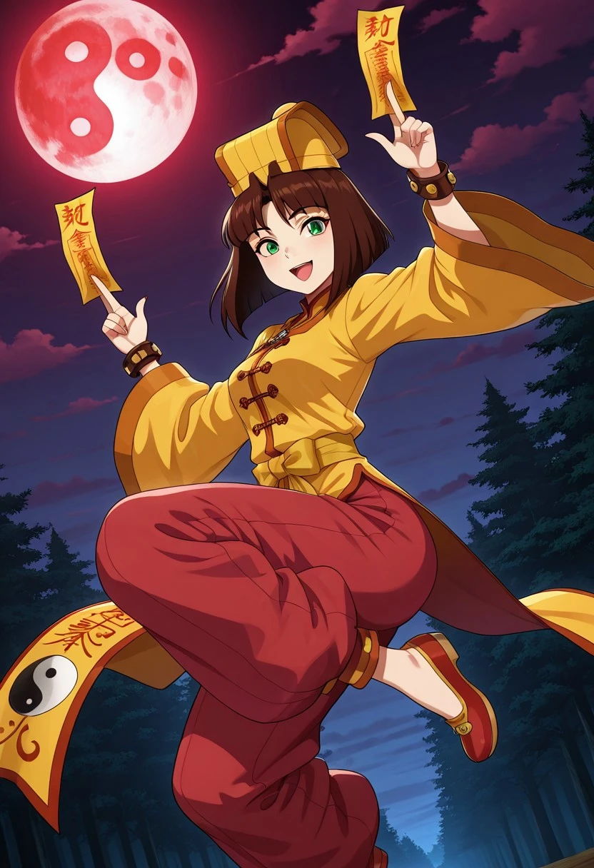 chinese clothes,red baggy pants,wide sleeves,yellow headwear,hat,bracelet, ofuda,yin yang,