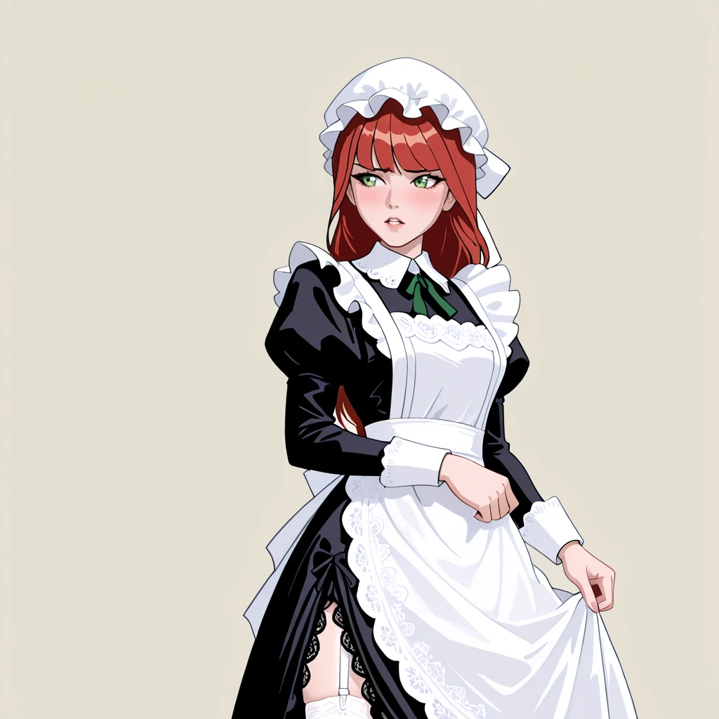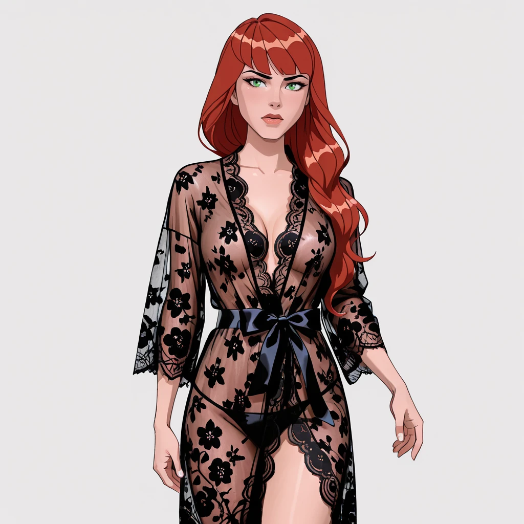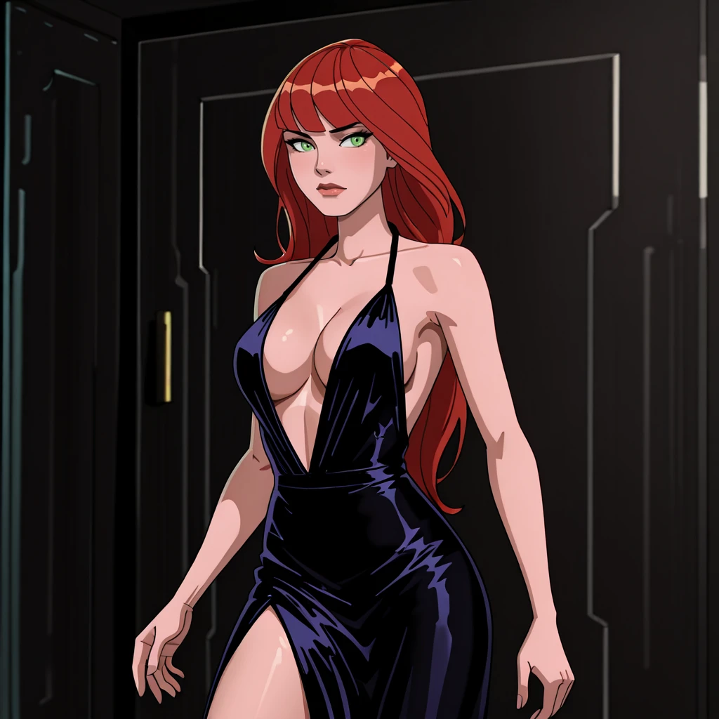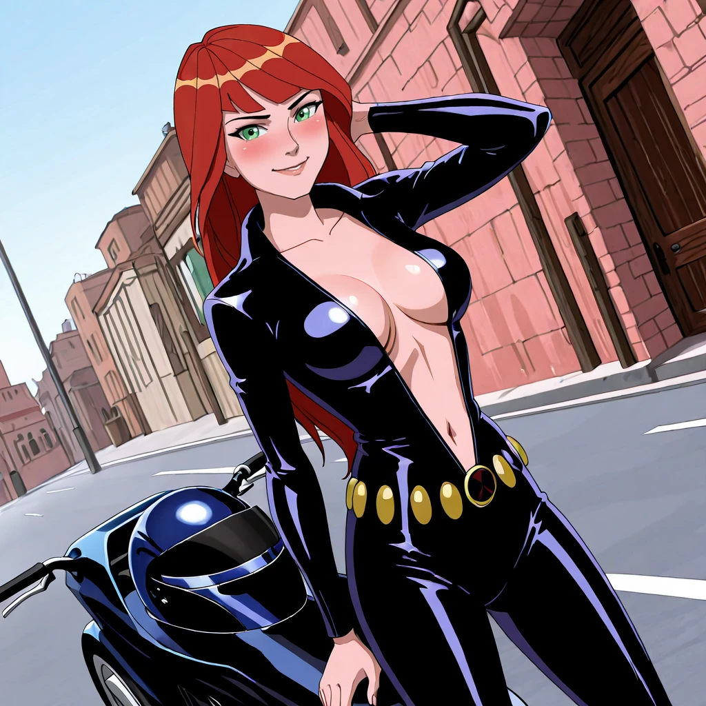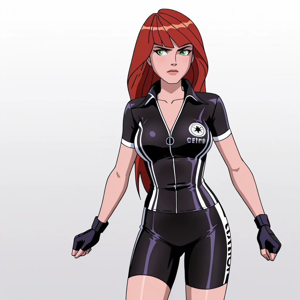 Trigger : BlackWidowEMH, 1girl, black bodysuit, long hair, green eyes, belt, red hair, black gloves, cowboy shot