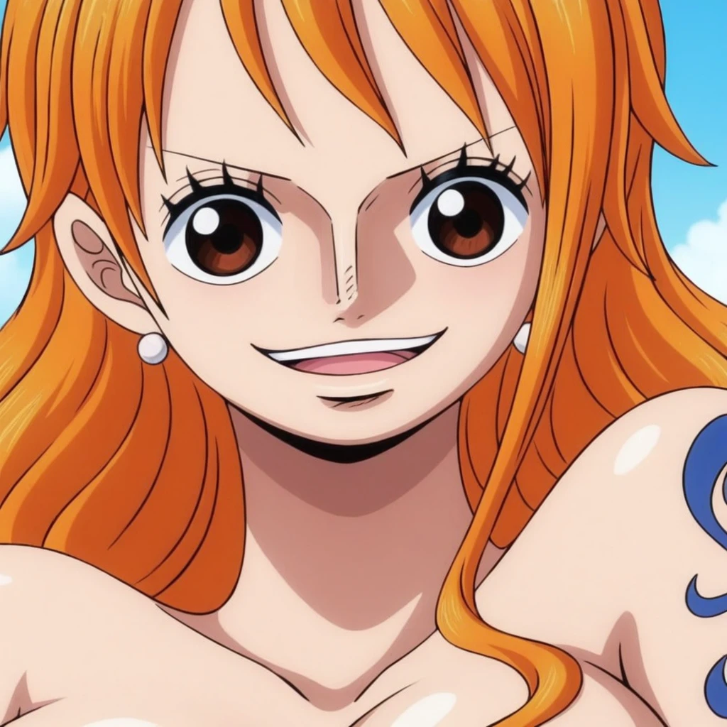 nami \(one piece\), eyelashes, single sidelock, (narrow waist:0.85), long hair, orange hair, large breast,