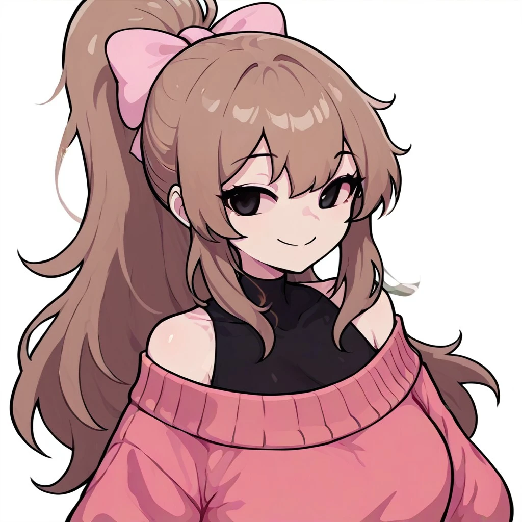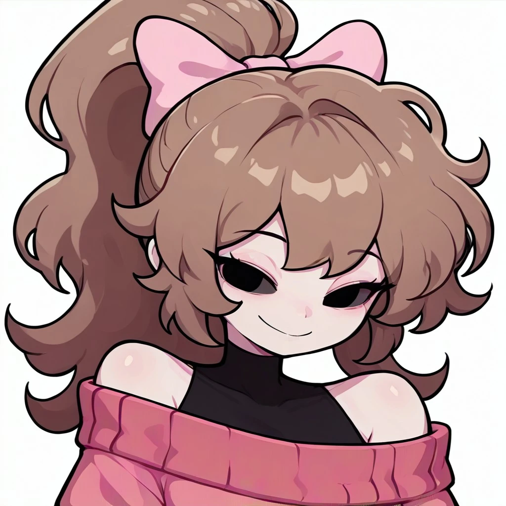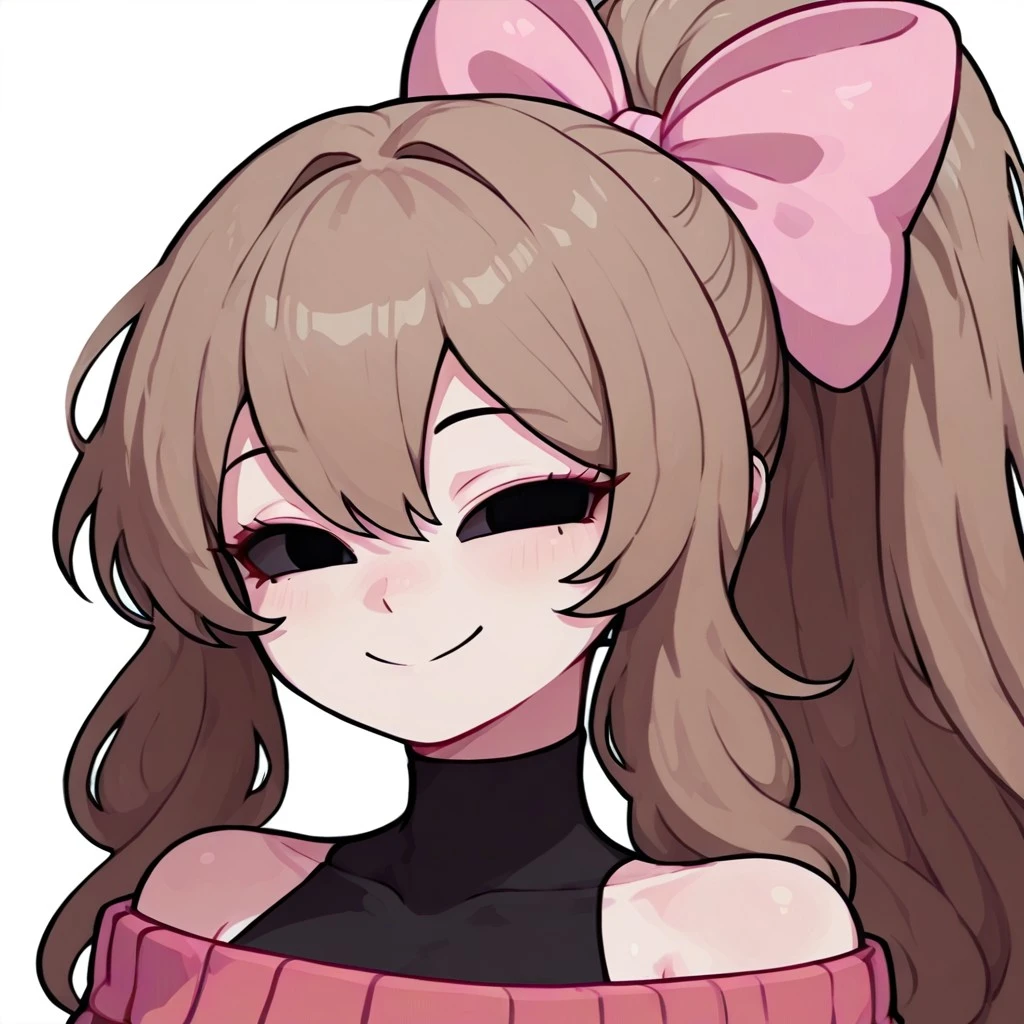 Prompt: GraceSoftGF, 1girl, light skin, long hair, soft brown hair, ponytail with a pink bow. She wears a pinkish-red long-sleeved sweater over a black undershirt, black eyes, bare shoulder, no sclera, smile,