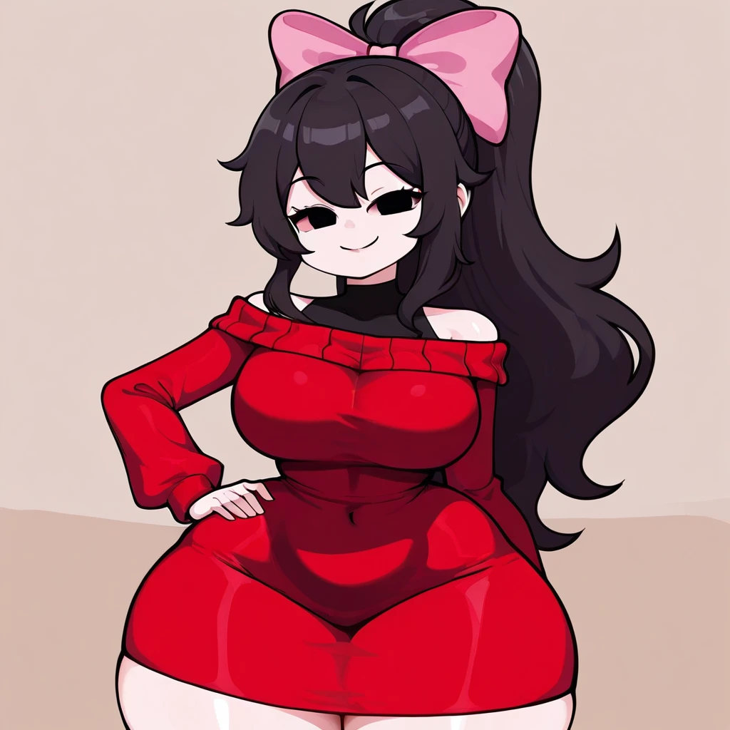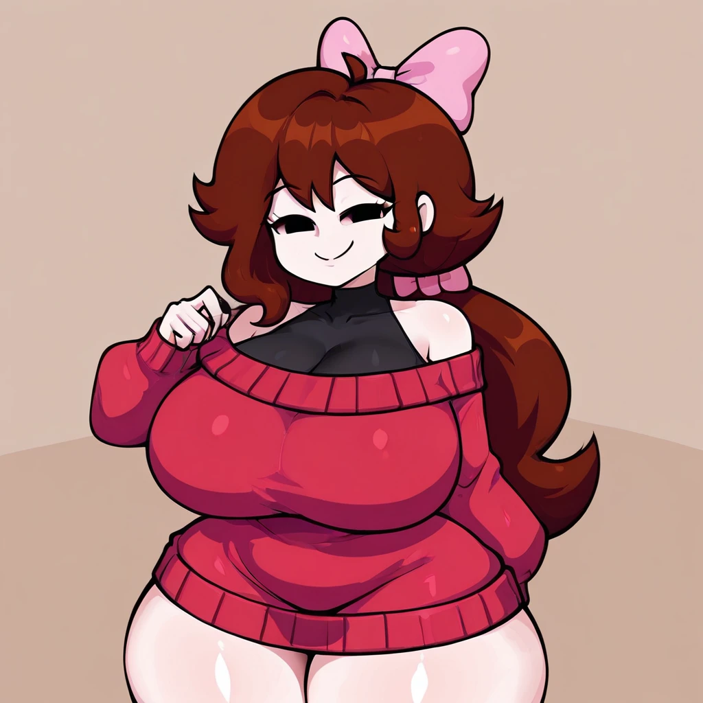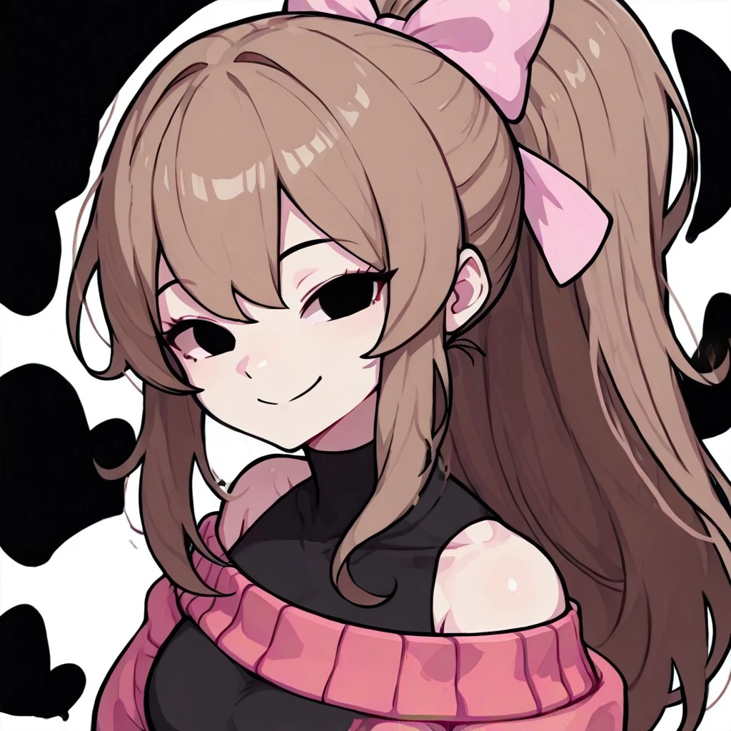 Prompt: GraceSoftGF, 1girl, light skin, long hair, soft brown hair, ponytail with a pink bow. She wears a pinkish-red long-sleeved sweater over a black undershirt, black eyes, bare shoulder, no sclera, smile,