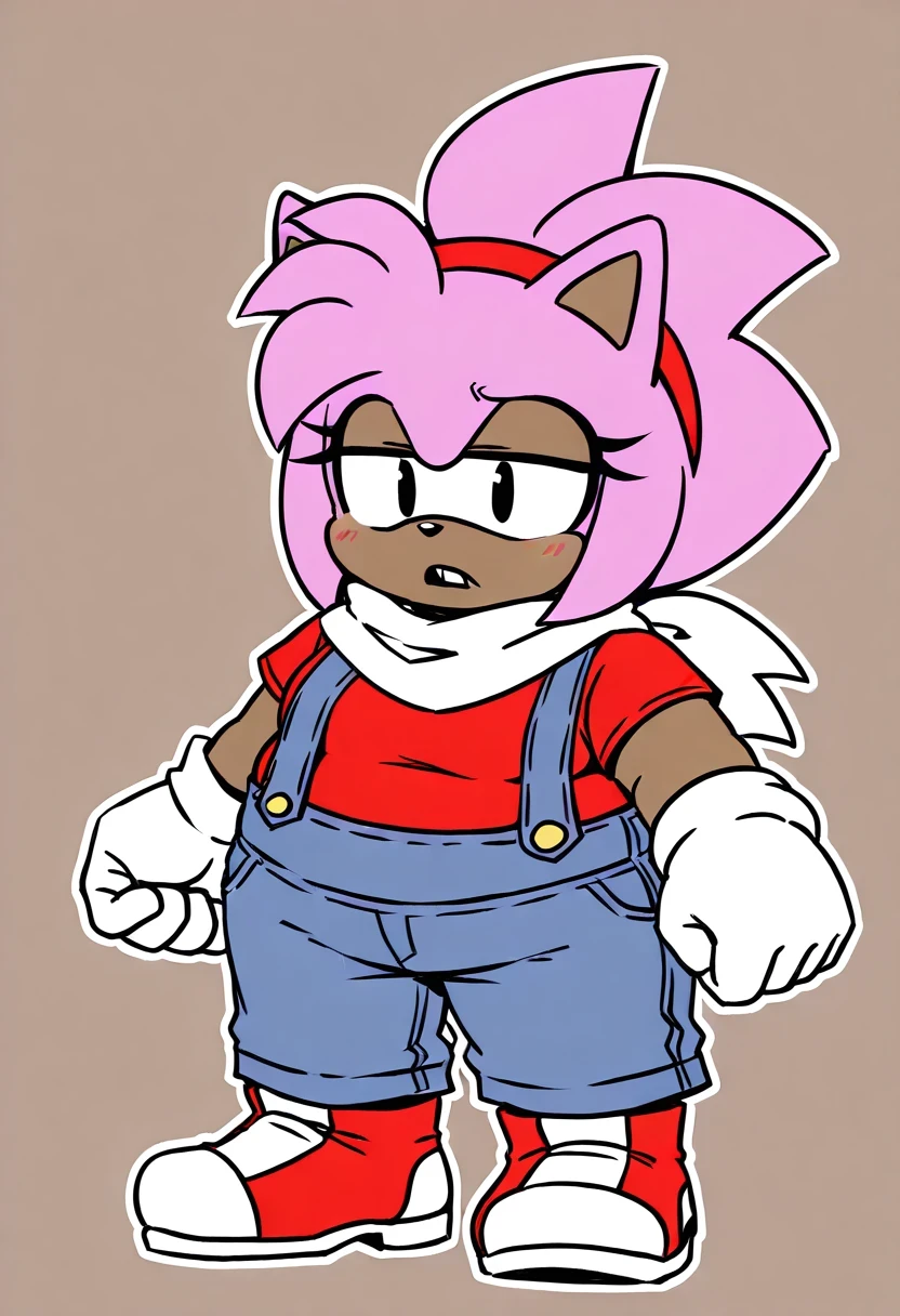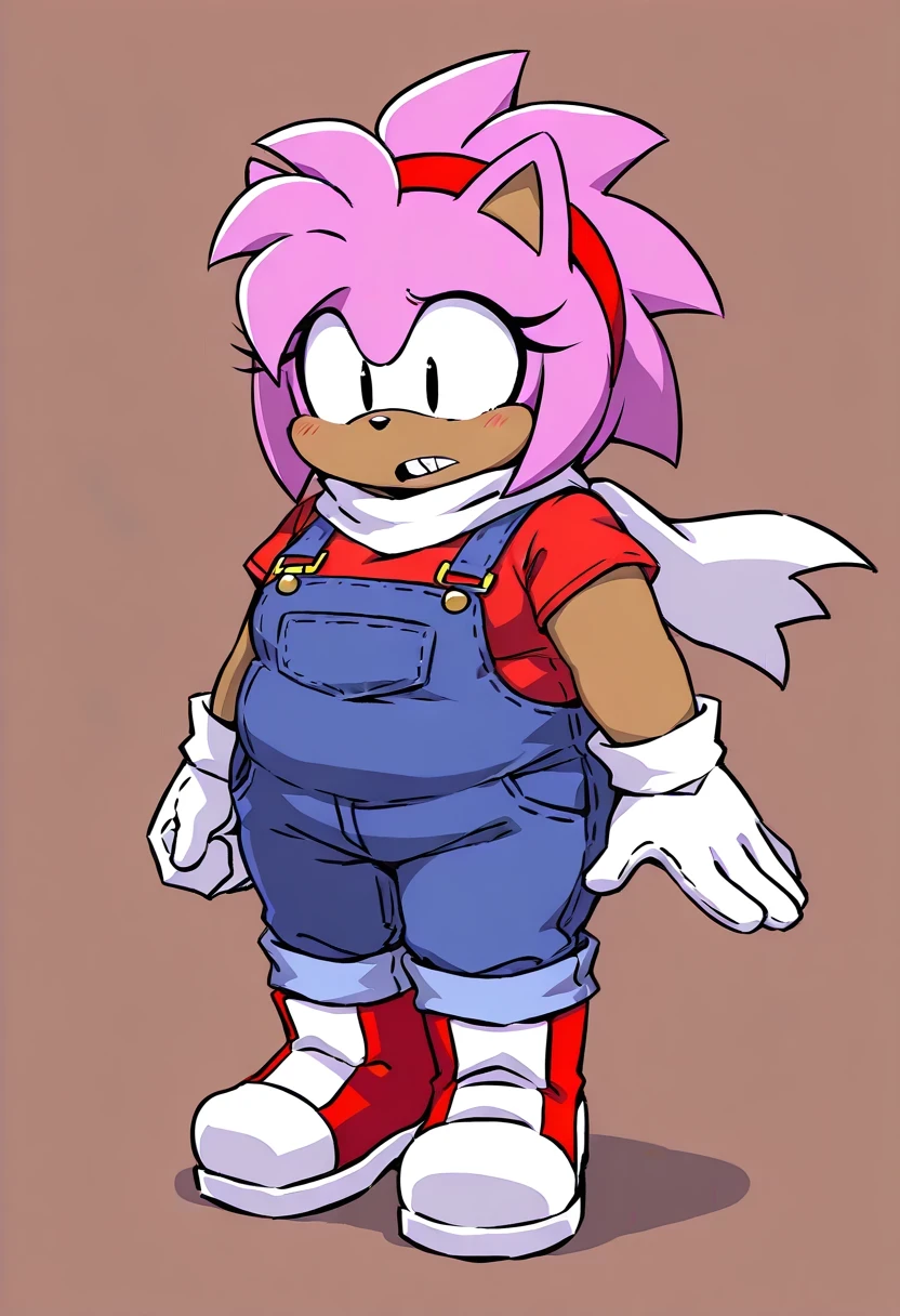 NormalAmyEXE, 1girl, fat, chubby, amy rose, pink fur, dark skin, two tone fur, black eyes, blue denim overalls, red shirt, red and white shoes, white scarf, buck teeth, red headband, white gloves,