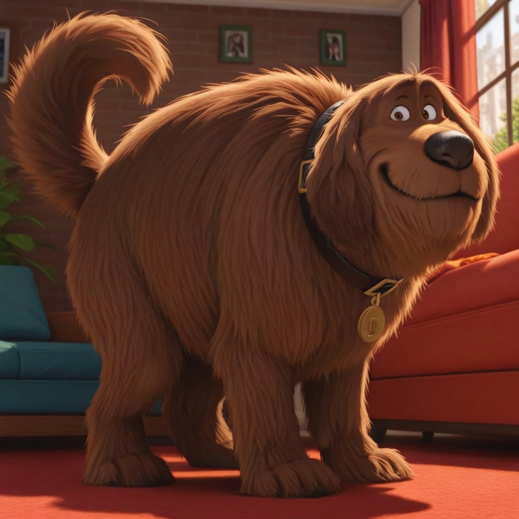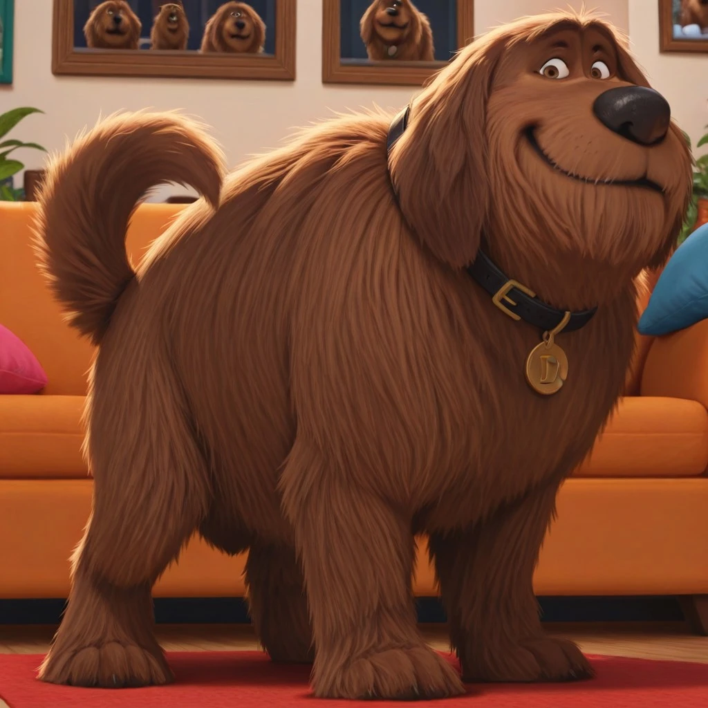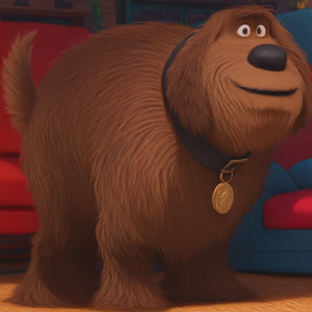 dog, brown fur, brown eyes, shaggy fur, dog tail, black nose, black collar, gold tag,
