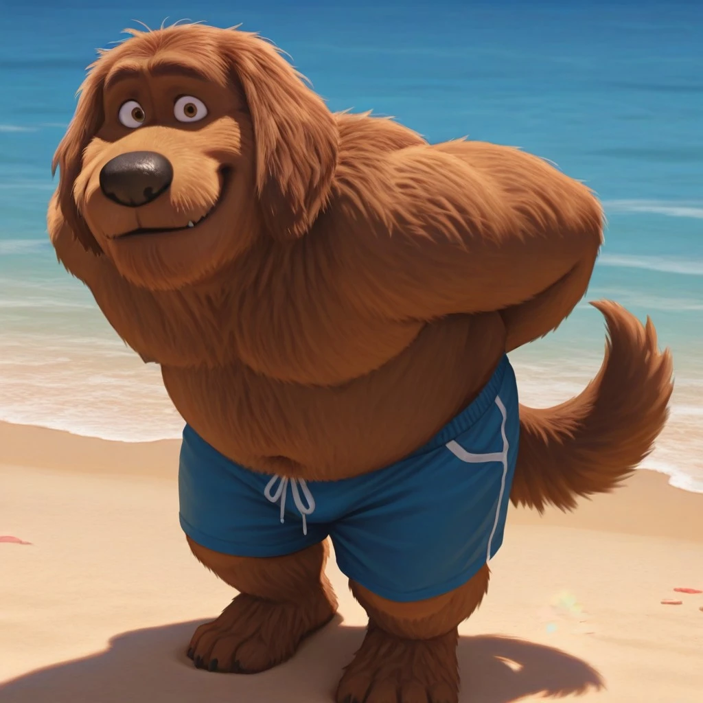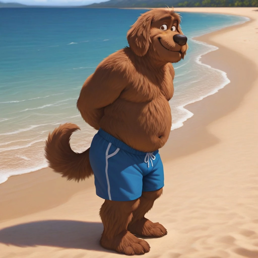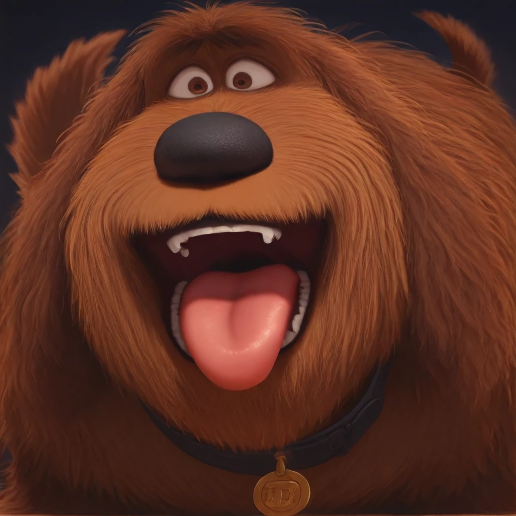 dog, brown fur, brown eyes, shaggy fur, dog tail, black nose, black collar, gold tag,