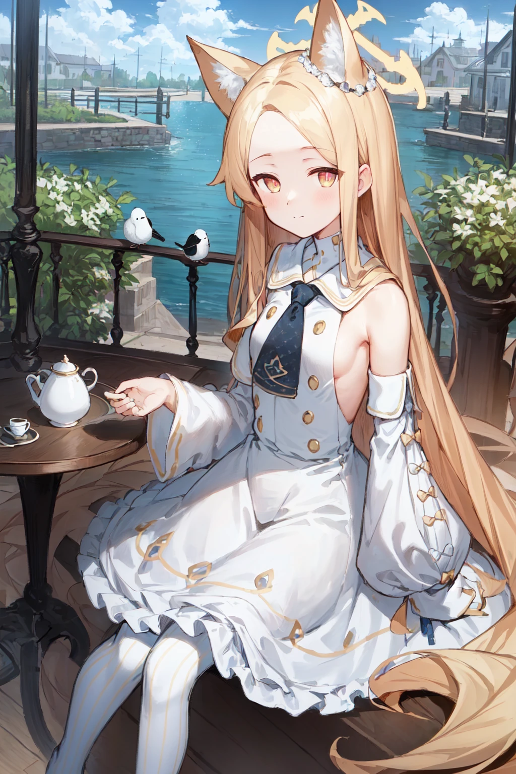 For her normal outfit: white dress, sleeveless dress, blue necktie, sleeves past wrists, sleeves past fingers, detached sleeves, white pantyhose, high heels
