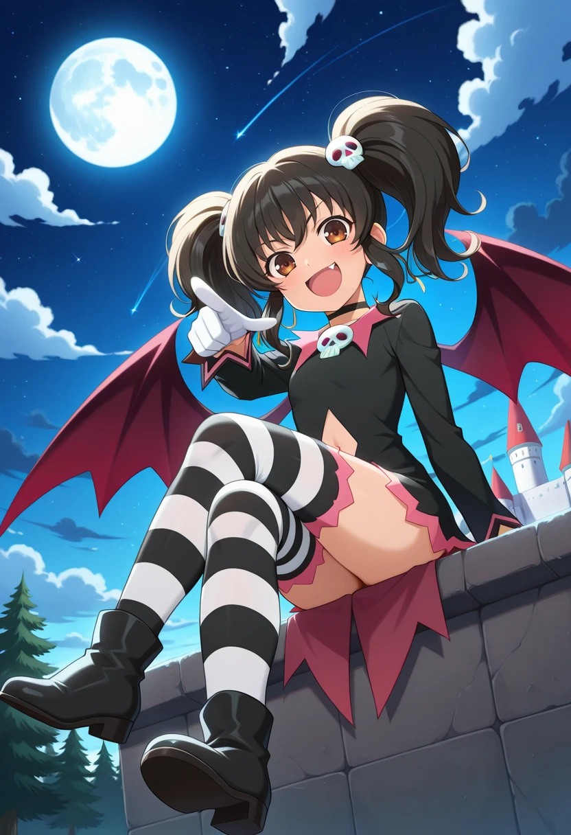 aniseDevil, black hair, brown eyes, twintails, sidelocks, skull hair ornament,black choker, clothing cutout, gloves, alternate costume, long sleeves, black dress, low wings, demon wings, striped legwear, black footwear, Yukata ゆかた