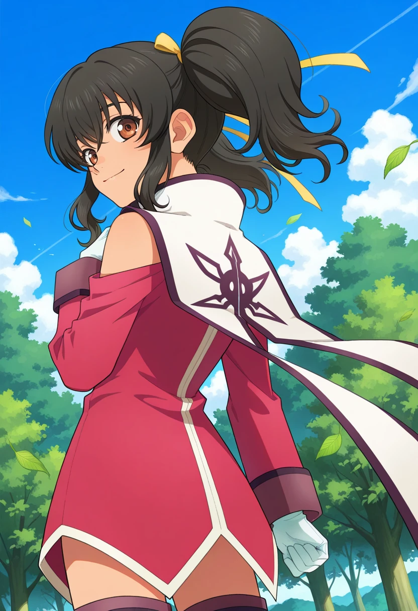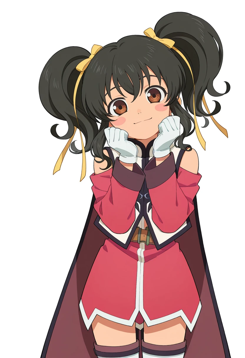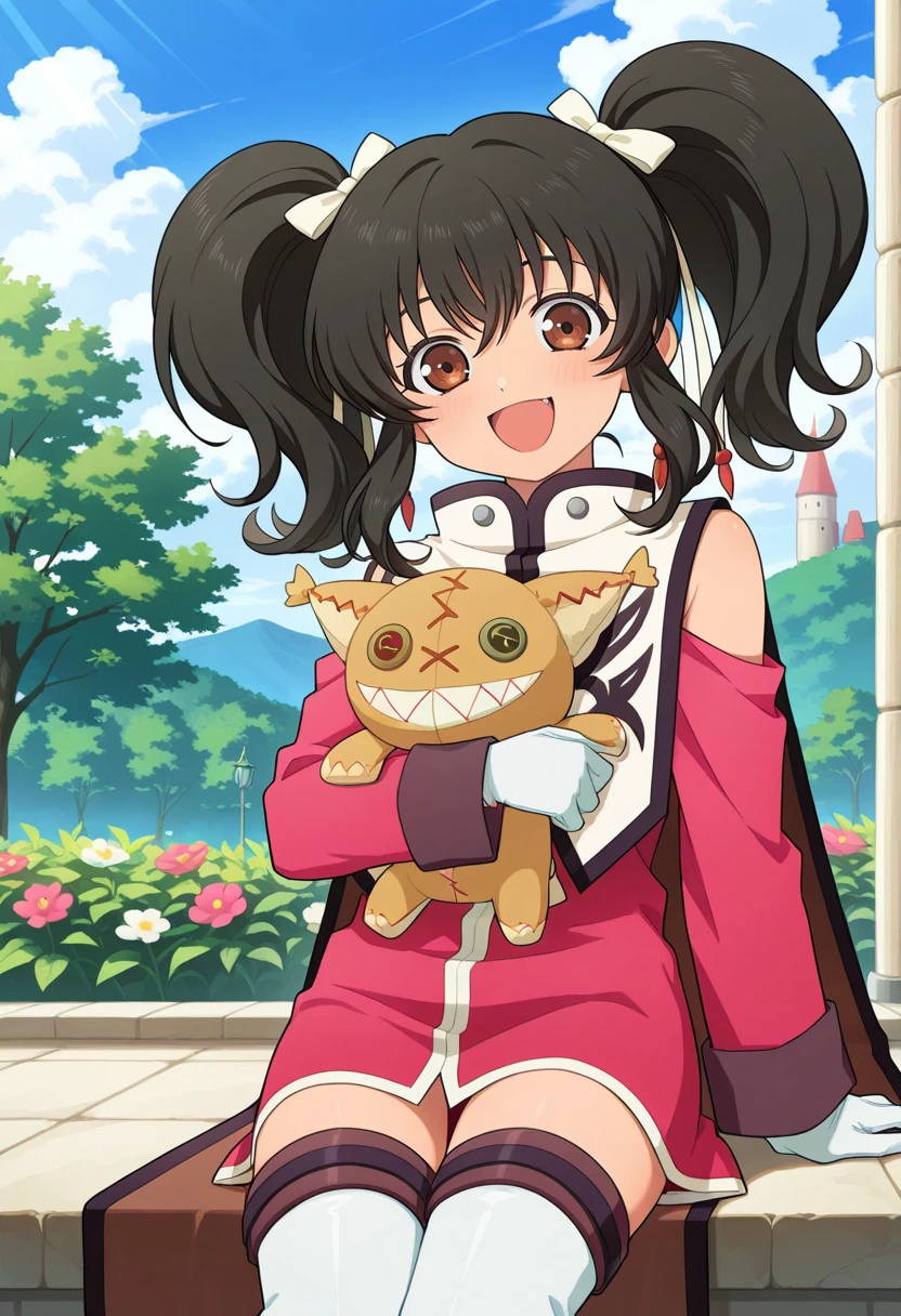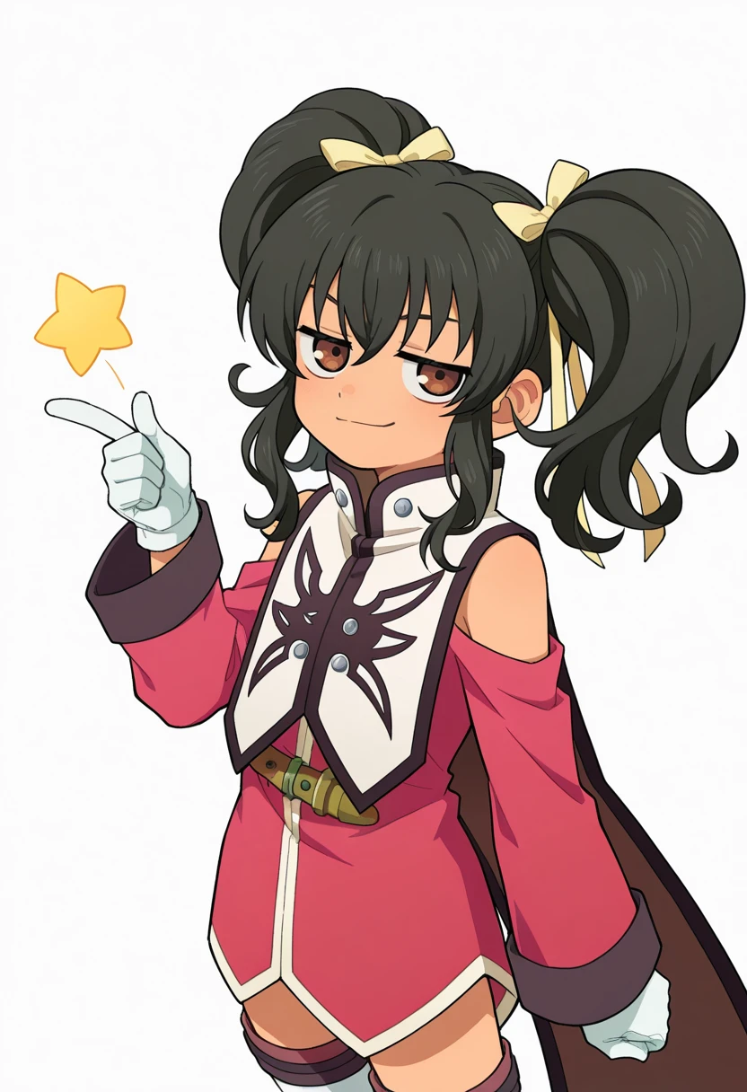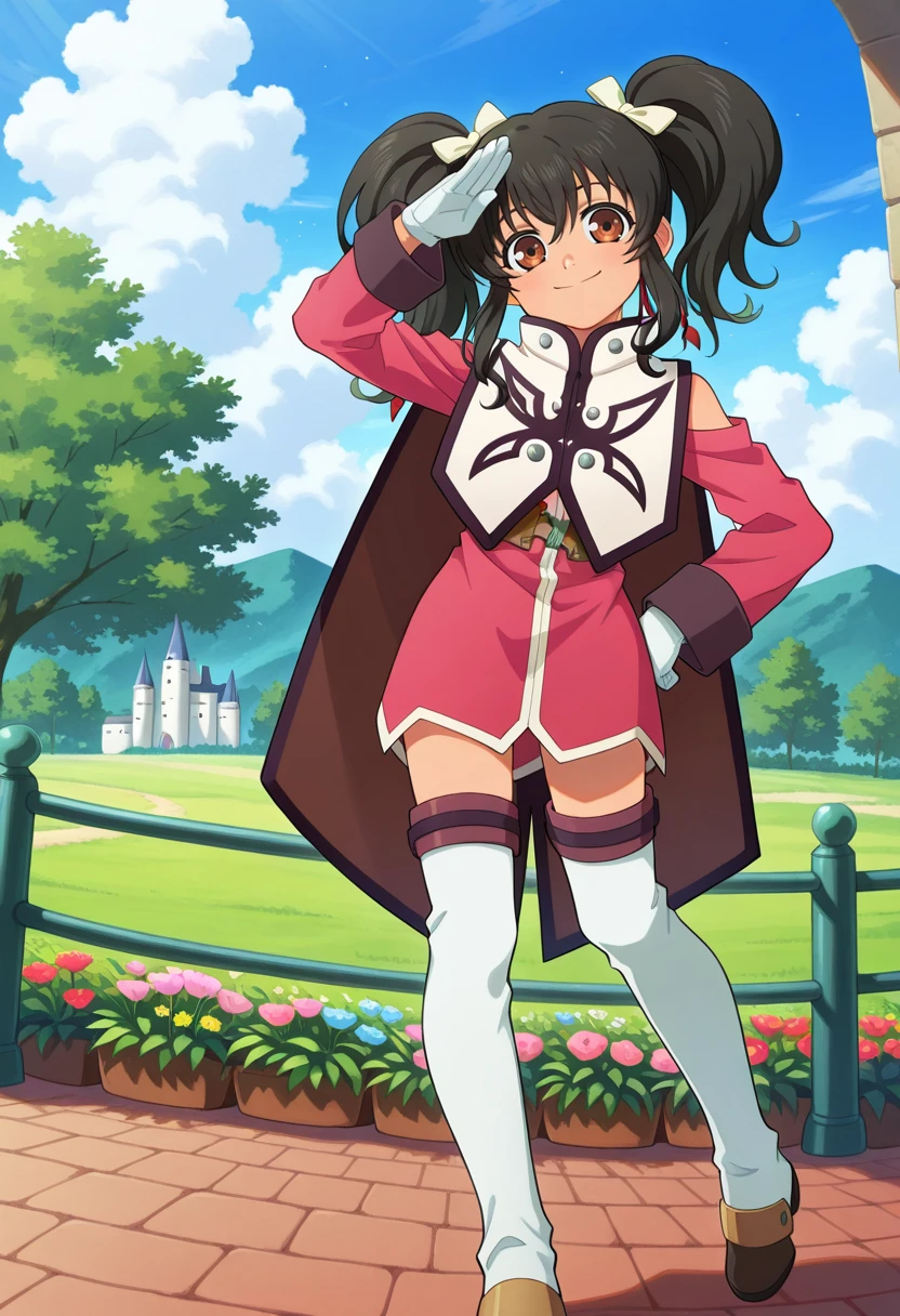 anisedef, black hair, brown eyes, twintails, sidelocks, hair bow,anisebase, white gloves, bare shoulders, detached collar, long sleeves, off shoulder, pink robe, tabard, capelet,thigh boots, white thigh boots,Little devil リトルデビっ子