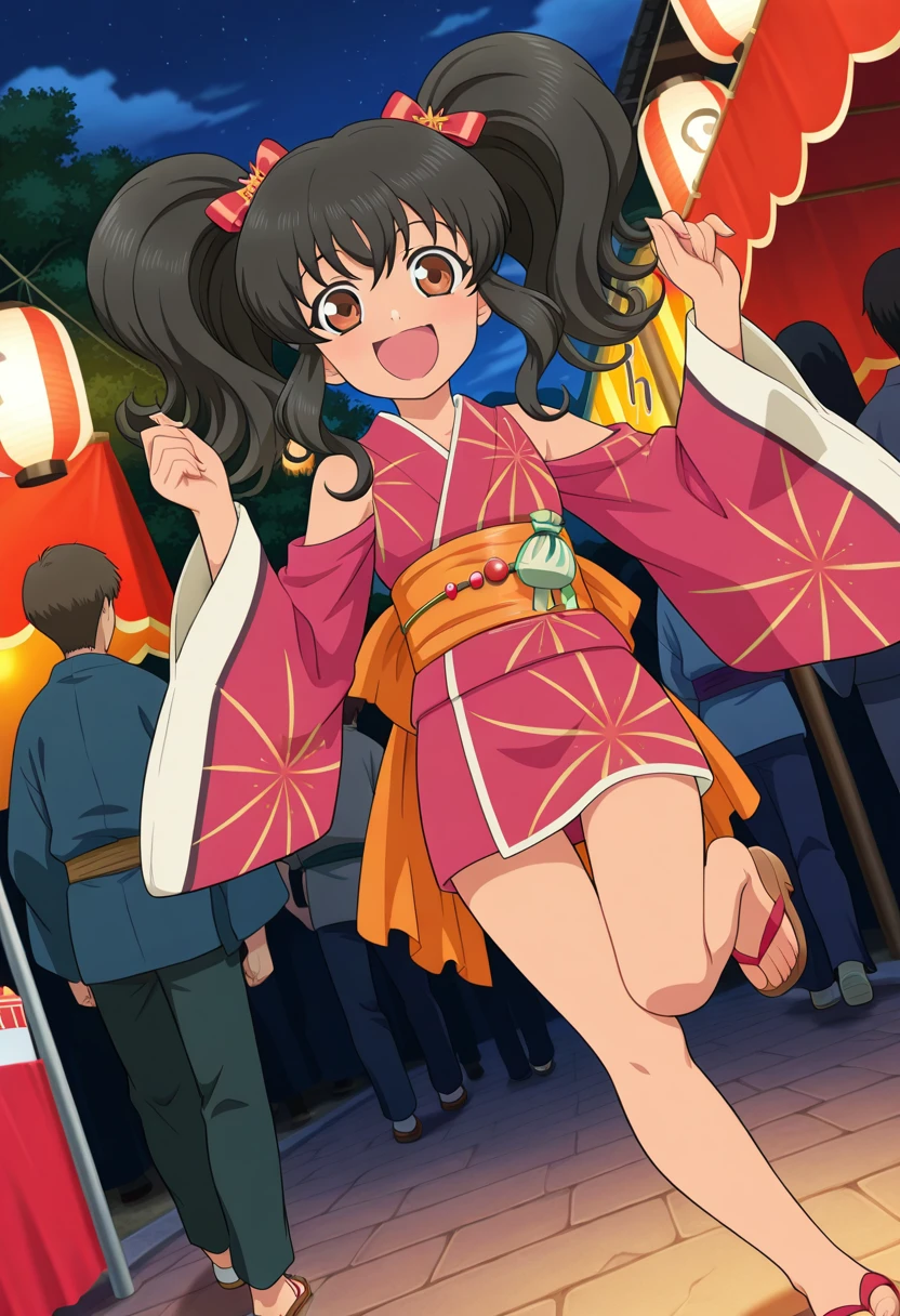 anisernd, aniseykt, black hair, hair ribbon, brown eyes, twintails, sidelocks,yukata, red yukata, short dress, long sleeves, bare shoulders, detached sleeves, geta, Swimsuit 子供じゃないモン!