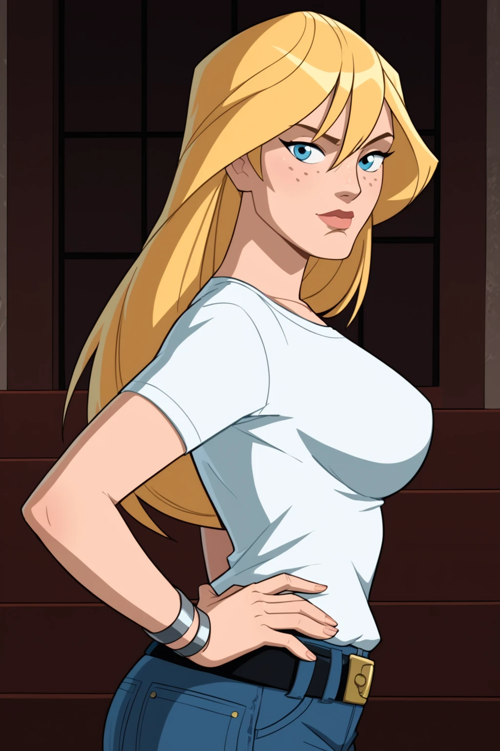 Base Prompt: bobbi morse, long hair, blonde hair, blue eyes, freckles
