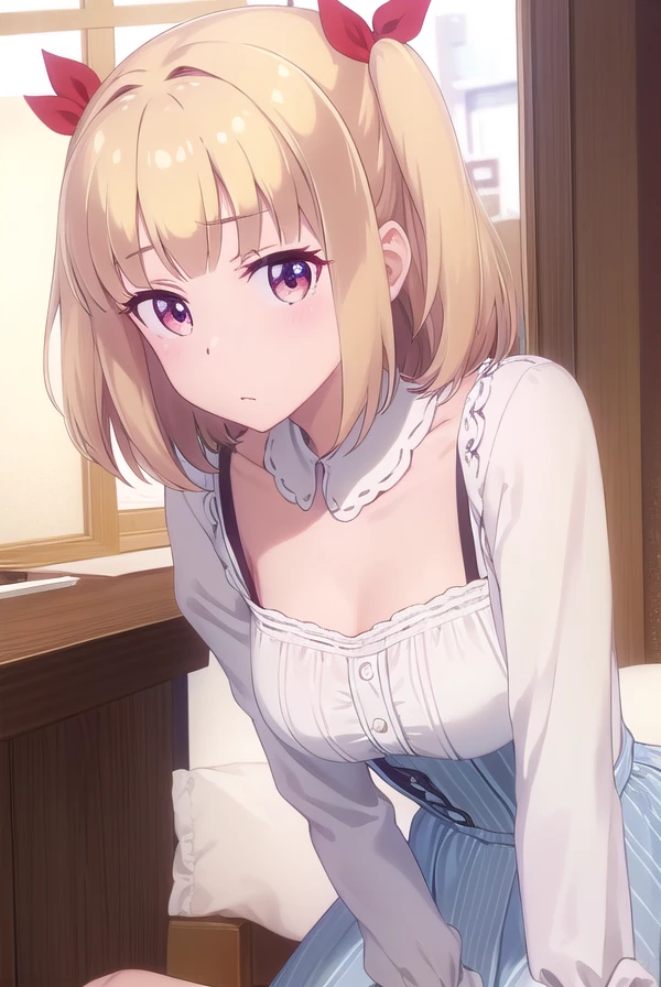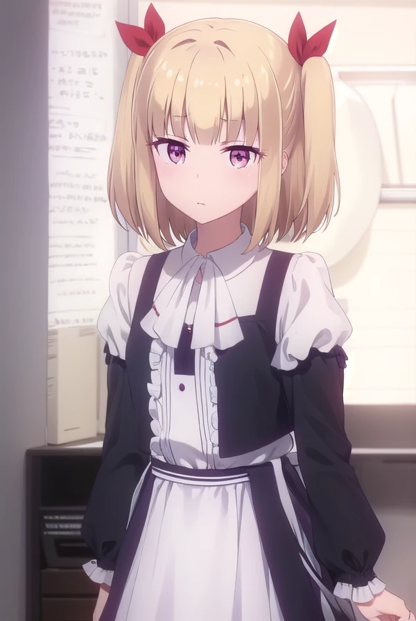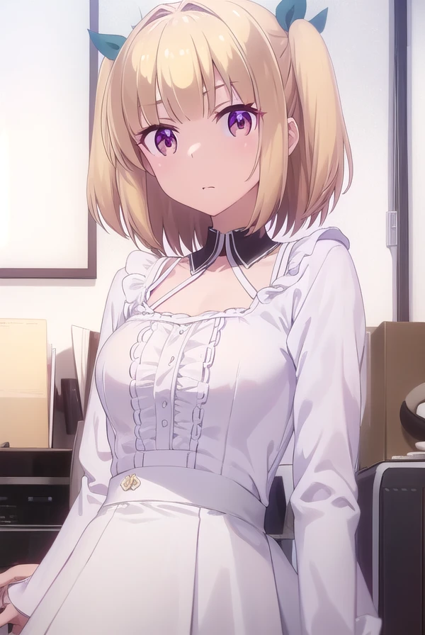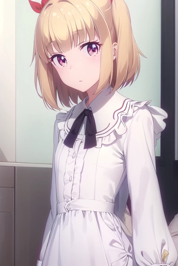 yun ijima, short hair, blonde hair, (red eyes:1.3), ribbon, hair ribbon, two side up,