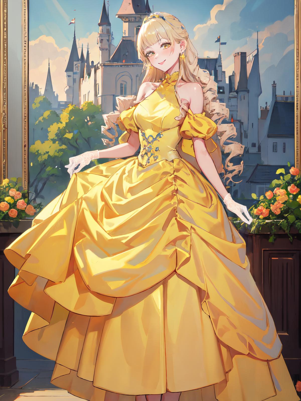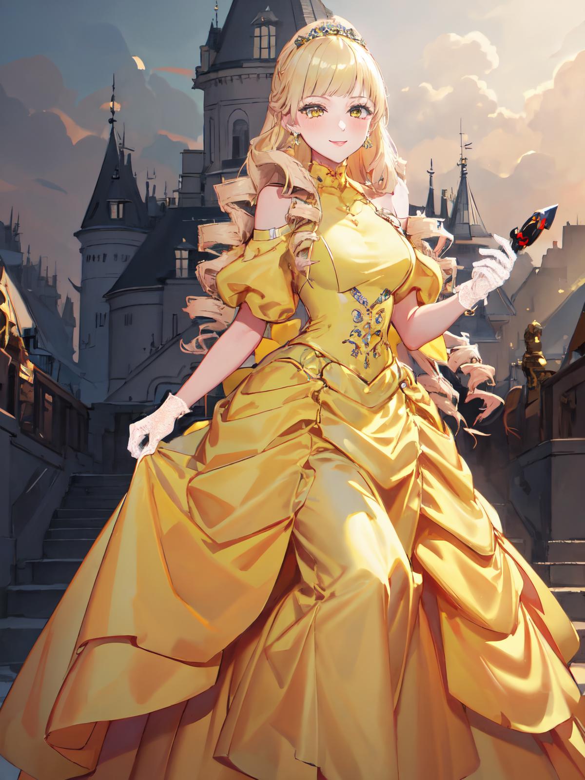 Recommended prompts: long dress, drill hair, blonde_hair, dress, earrings, gloves, long_hair, standing, white_gloves, yellow_dress, yellow_eyes