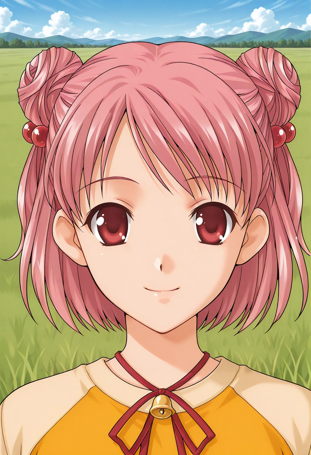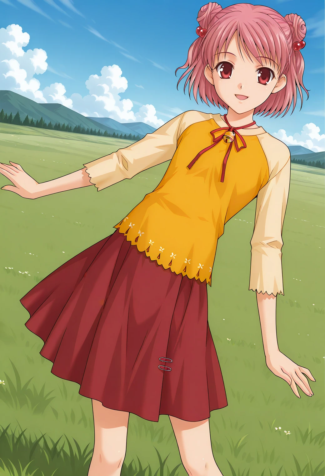 ever17_coco, red eyes, pink hair, short hair, double bun, hair bobbles, bell, red ribbon, neck ribbon, yellow shirt, raglan sleeves, red skirt,