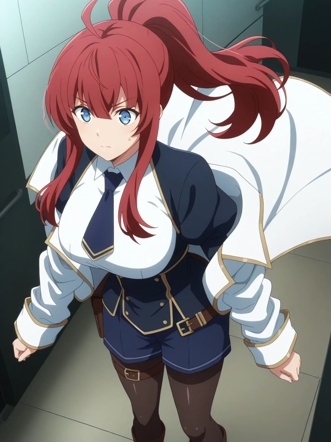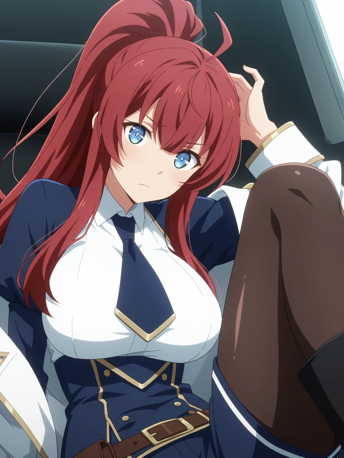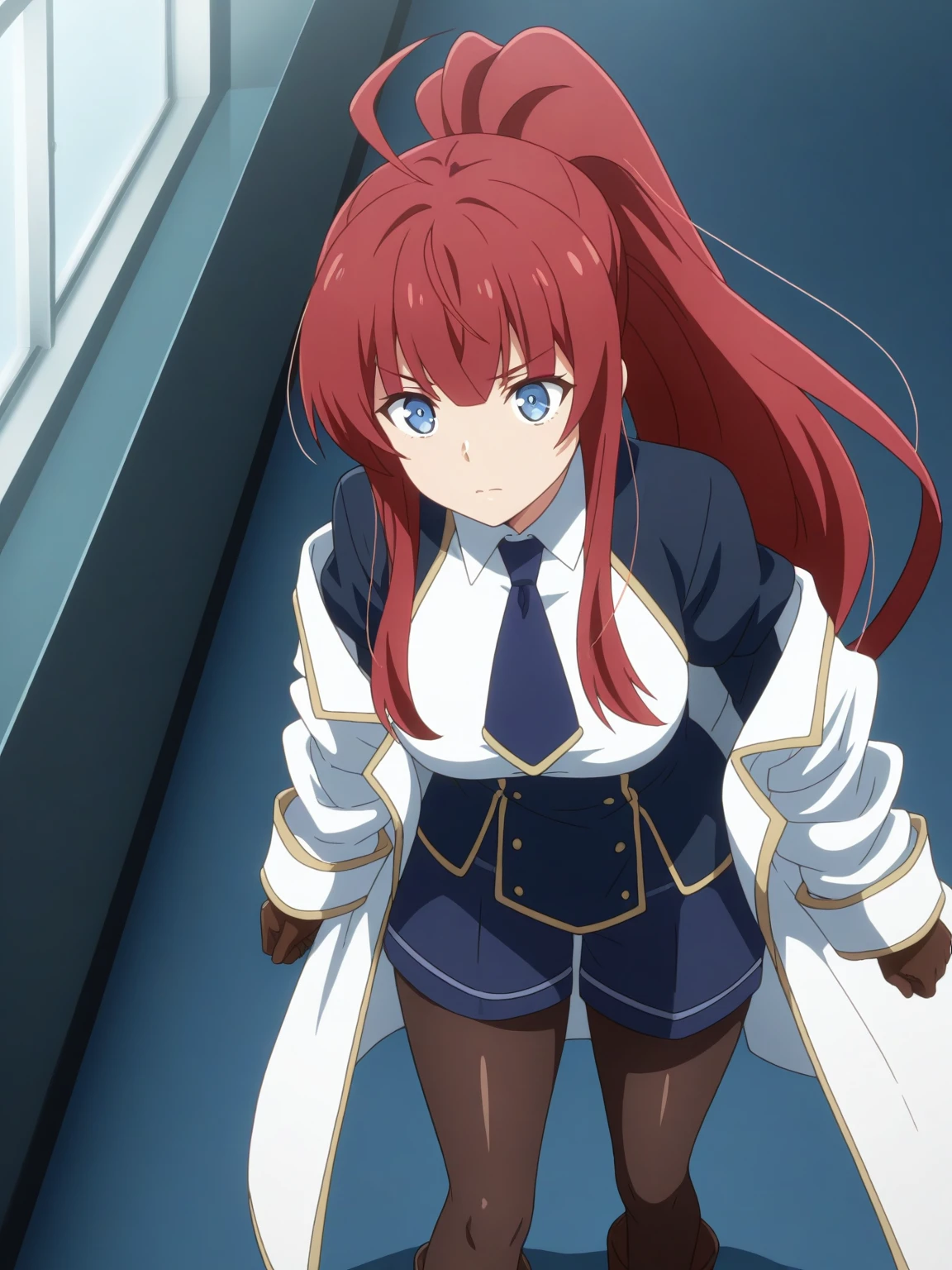 Character: (NeneAlkastone, blue eyes, red hair, high ponytail, sidelocks, ahoge)