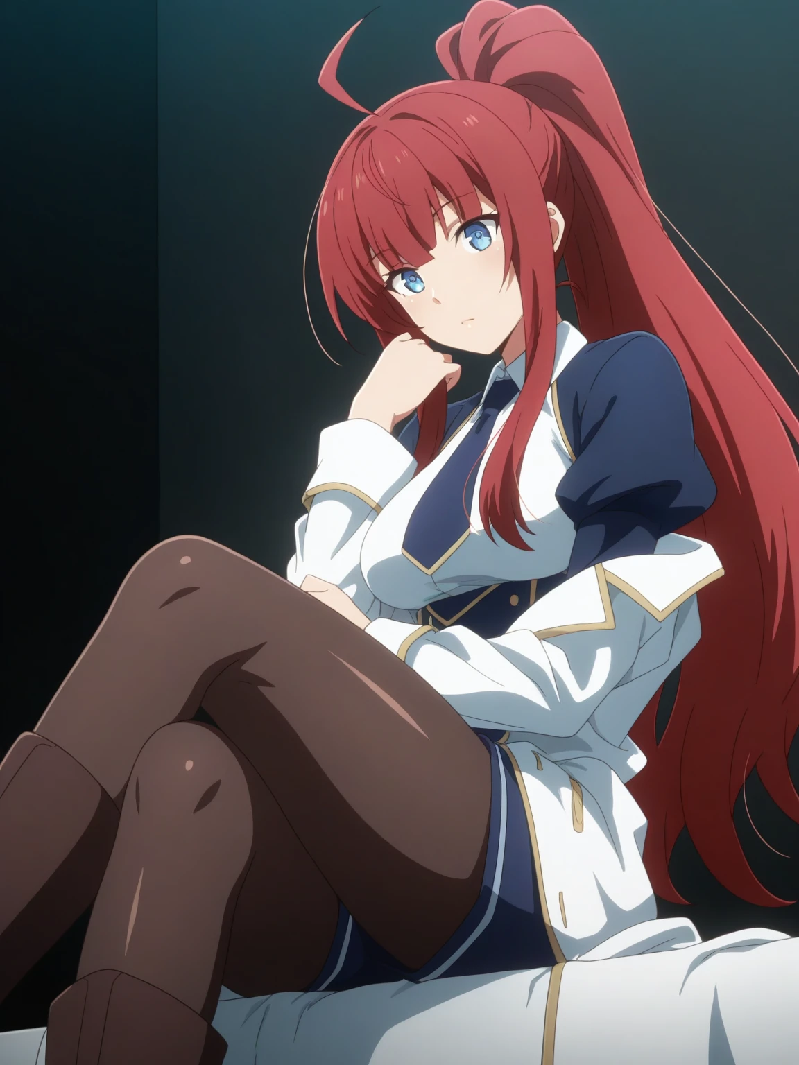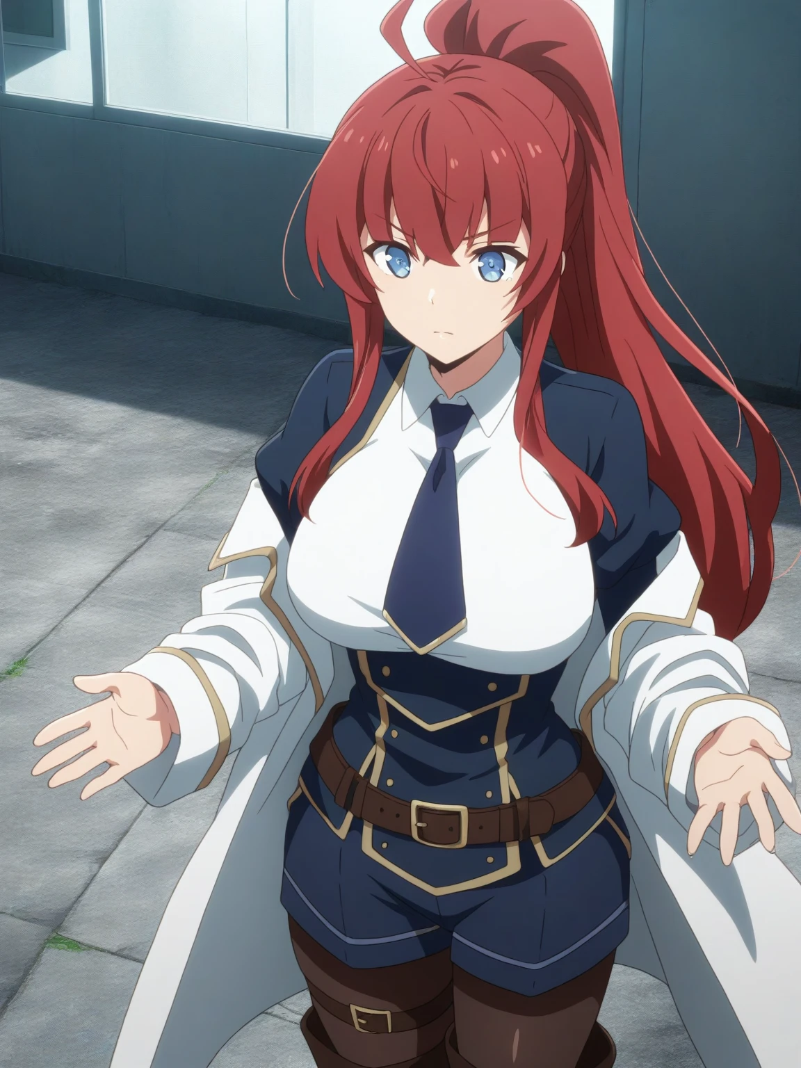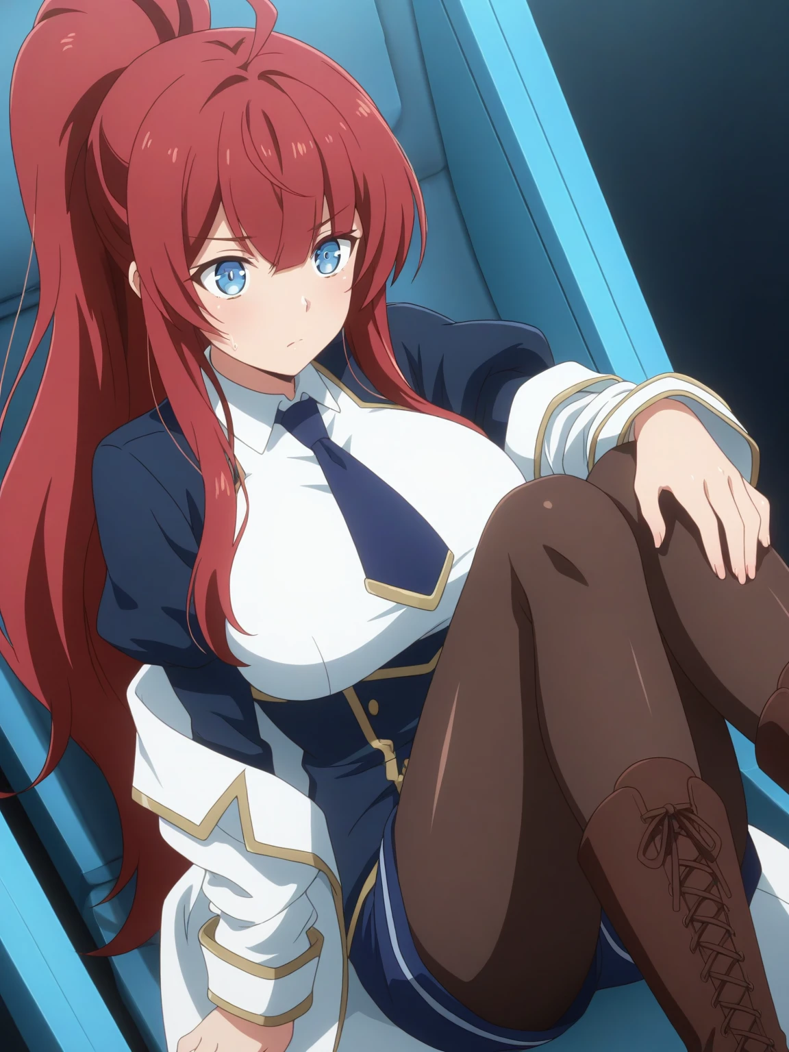 Character: (NeneAlkastone, blue eyes, red hair, high ponytail, sidelocks, ahoge)
