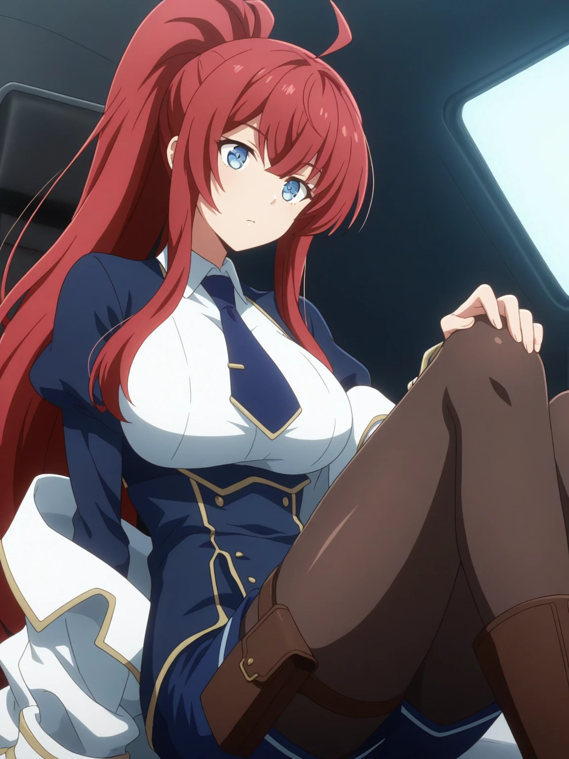 Clothes: coat, uniform, necktie, shorts, pantyhose, boots