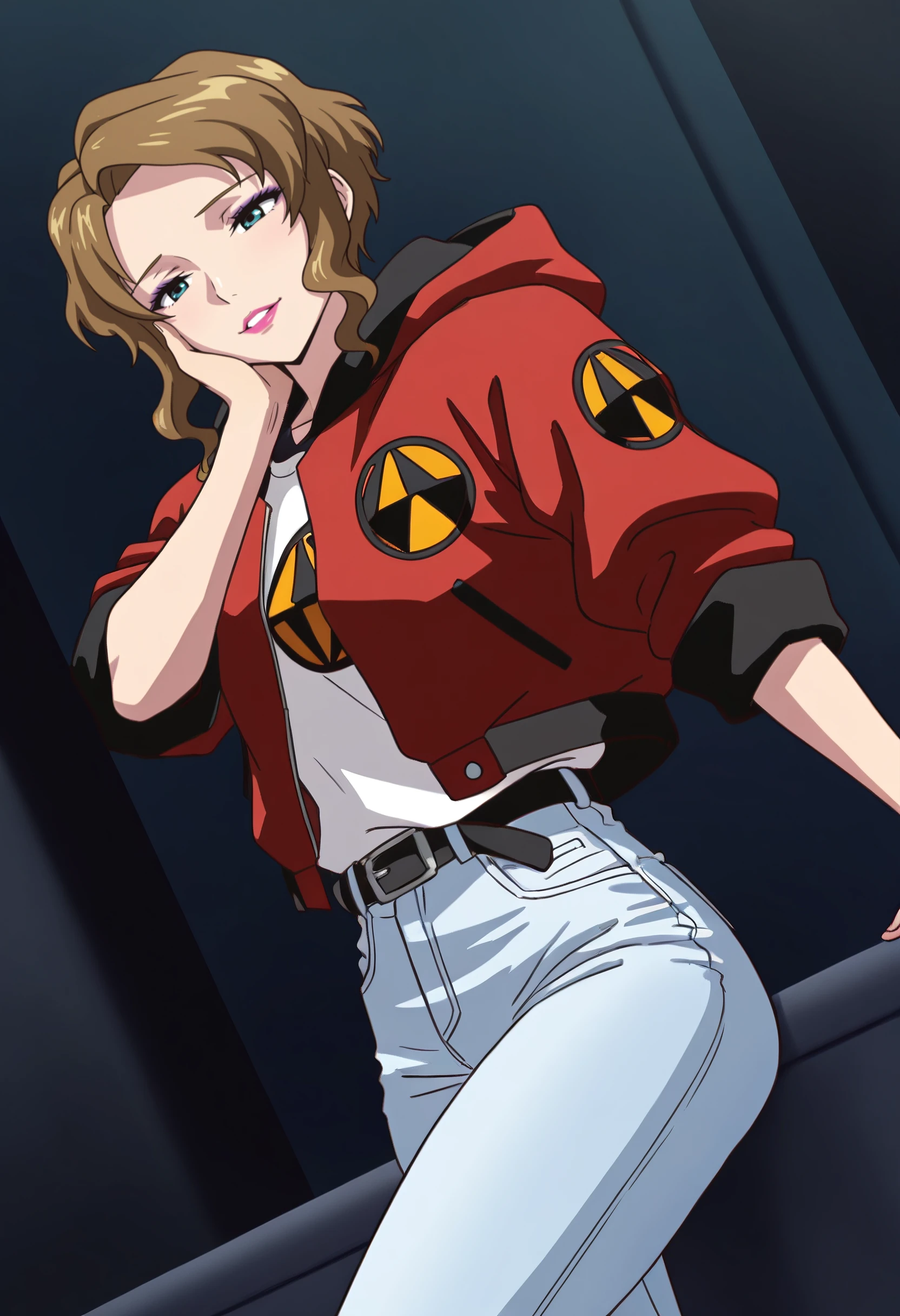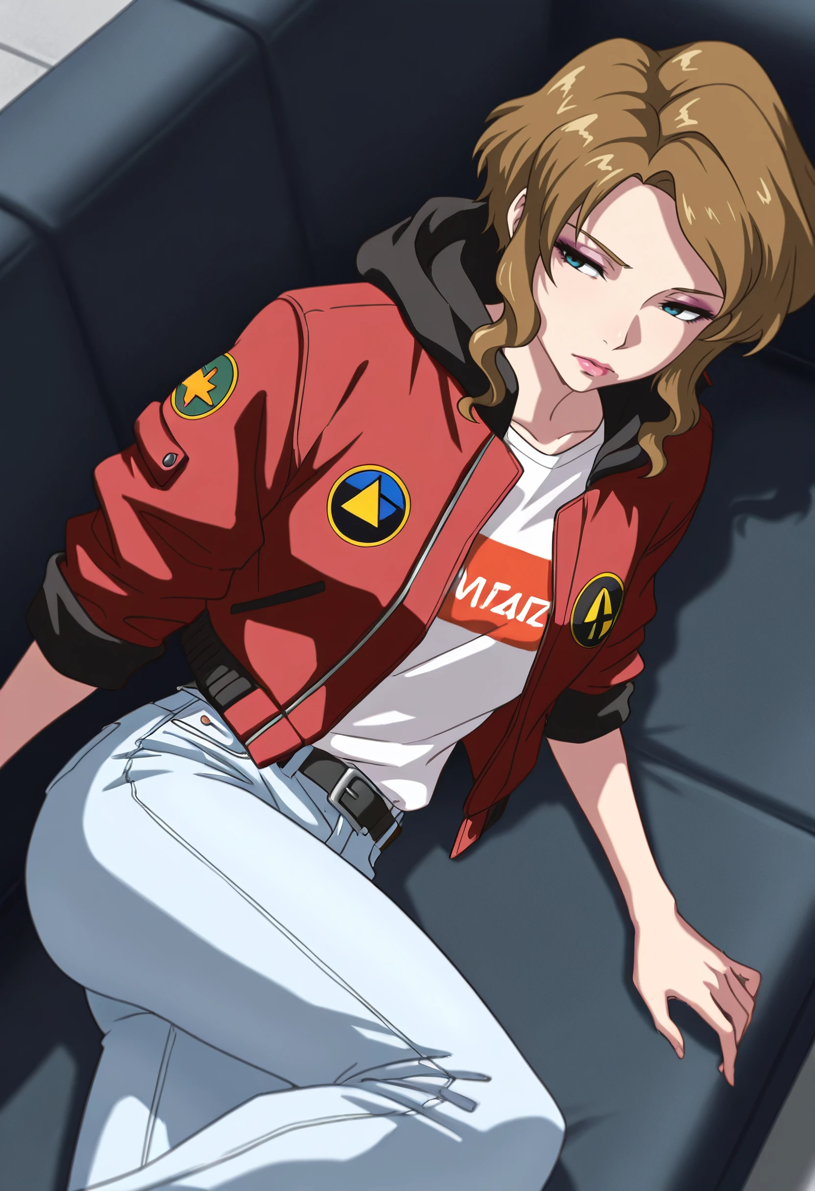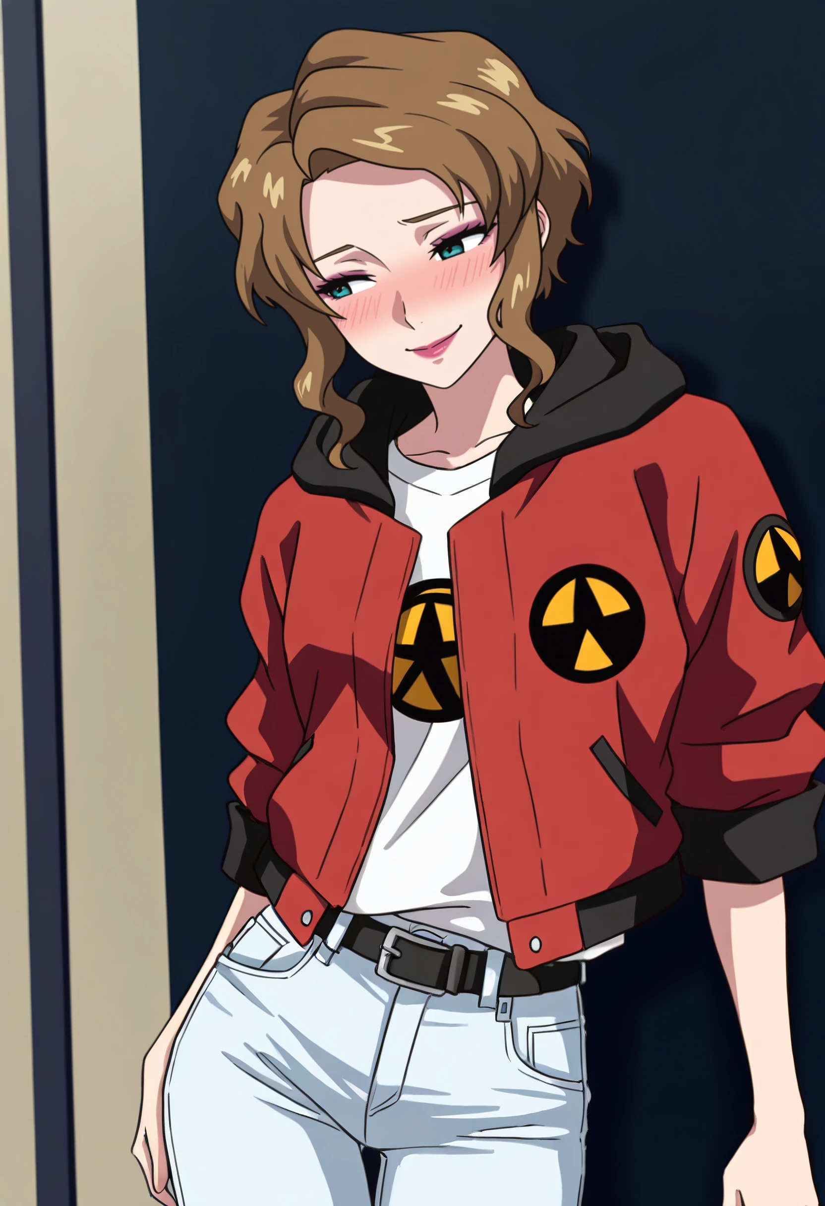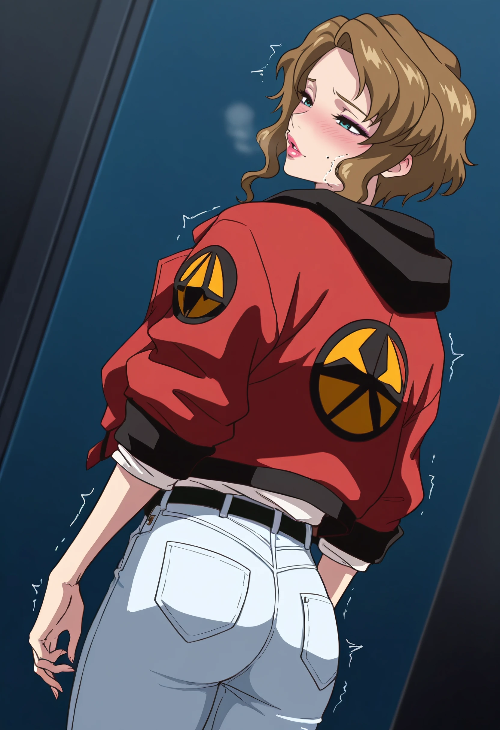 EricaOutfit, white pants, red jacket, pants, jacket, shirt, jeans, belt, denim, hood, baggy clothes, hood down, black belt, white shirt, undershirt, sleeves rolled up,