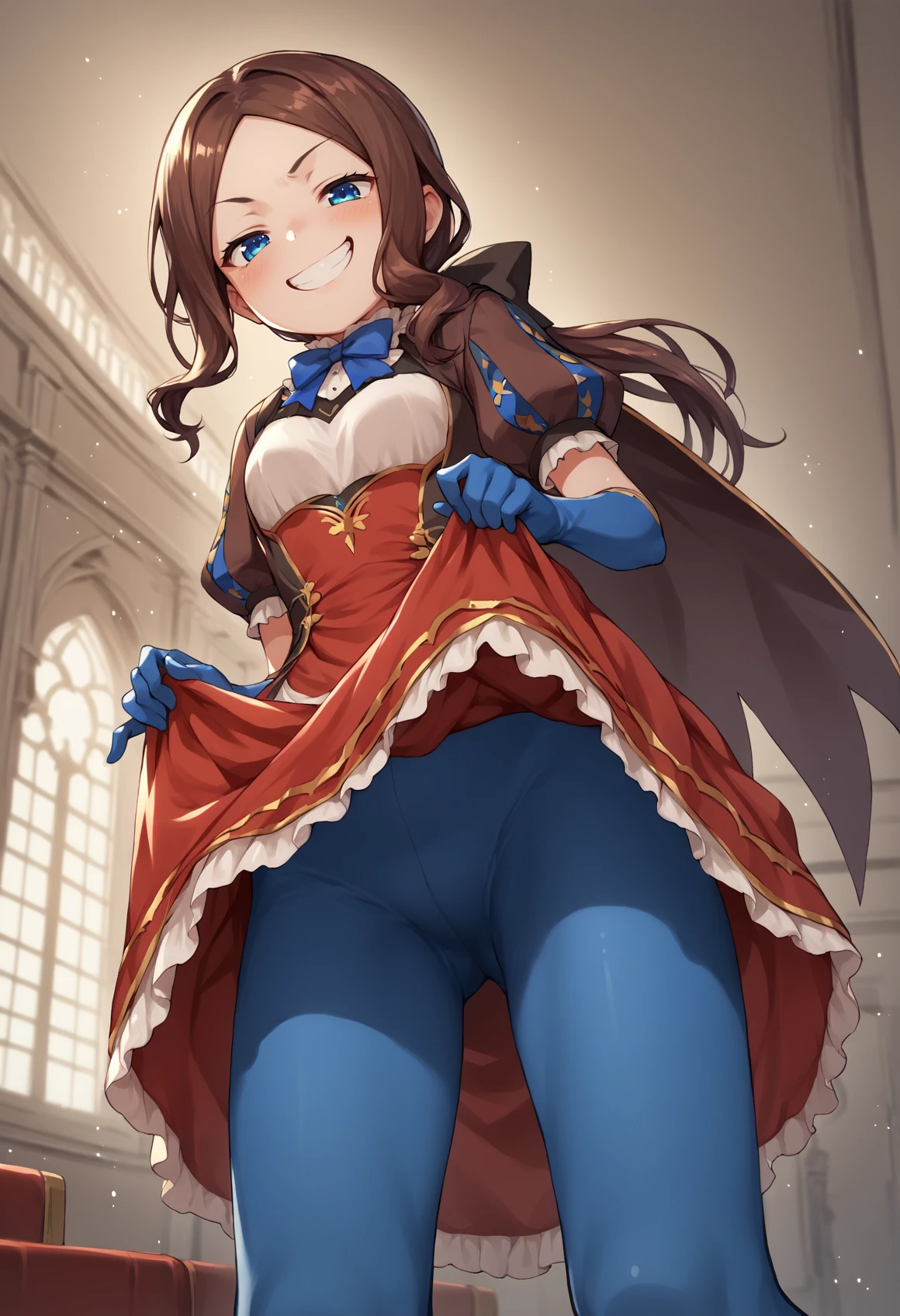1st Ascension: low ponytail, ribbon, dress, white shirt, puffy sleeves, short sleeves, red skirt, cape, blue pantyhose, elbow gloves, single gauntlet, shoes