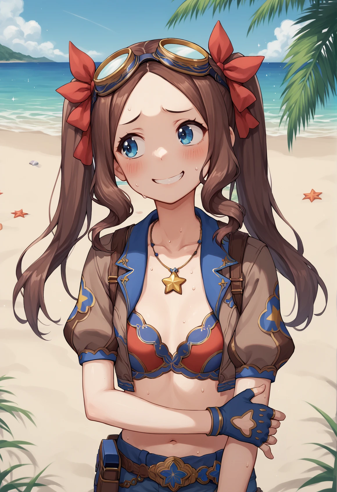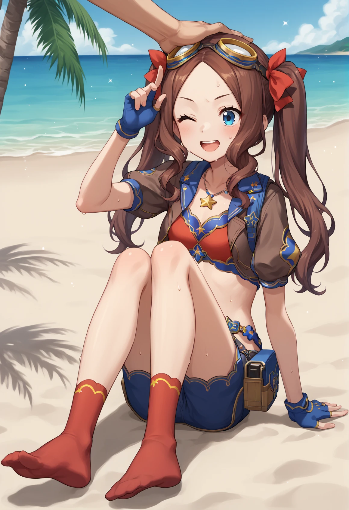Swimsuit: twintails, red hair ribbon, star \(symbol\), necklace, Goggles On Head, bra, cropped jacket, puffy sleeves, short sleeves, blue shorts, belt, fingerless gloves, Cross-Laced Footwear