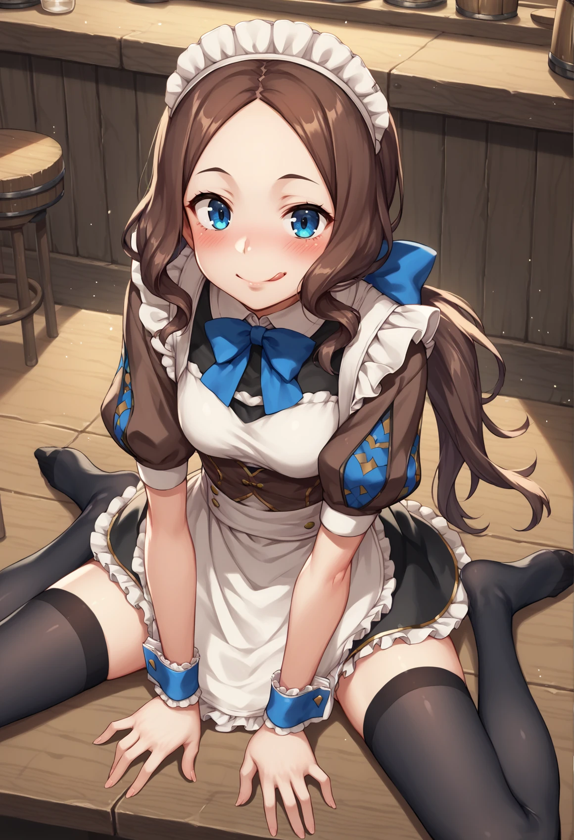 Maid: low ponytail, ribbon, puffy sleeves, short sleeves, wrist cuffs, maid, apron, maid headdress, black Thighhighs