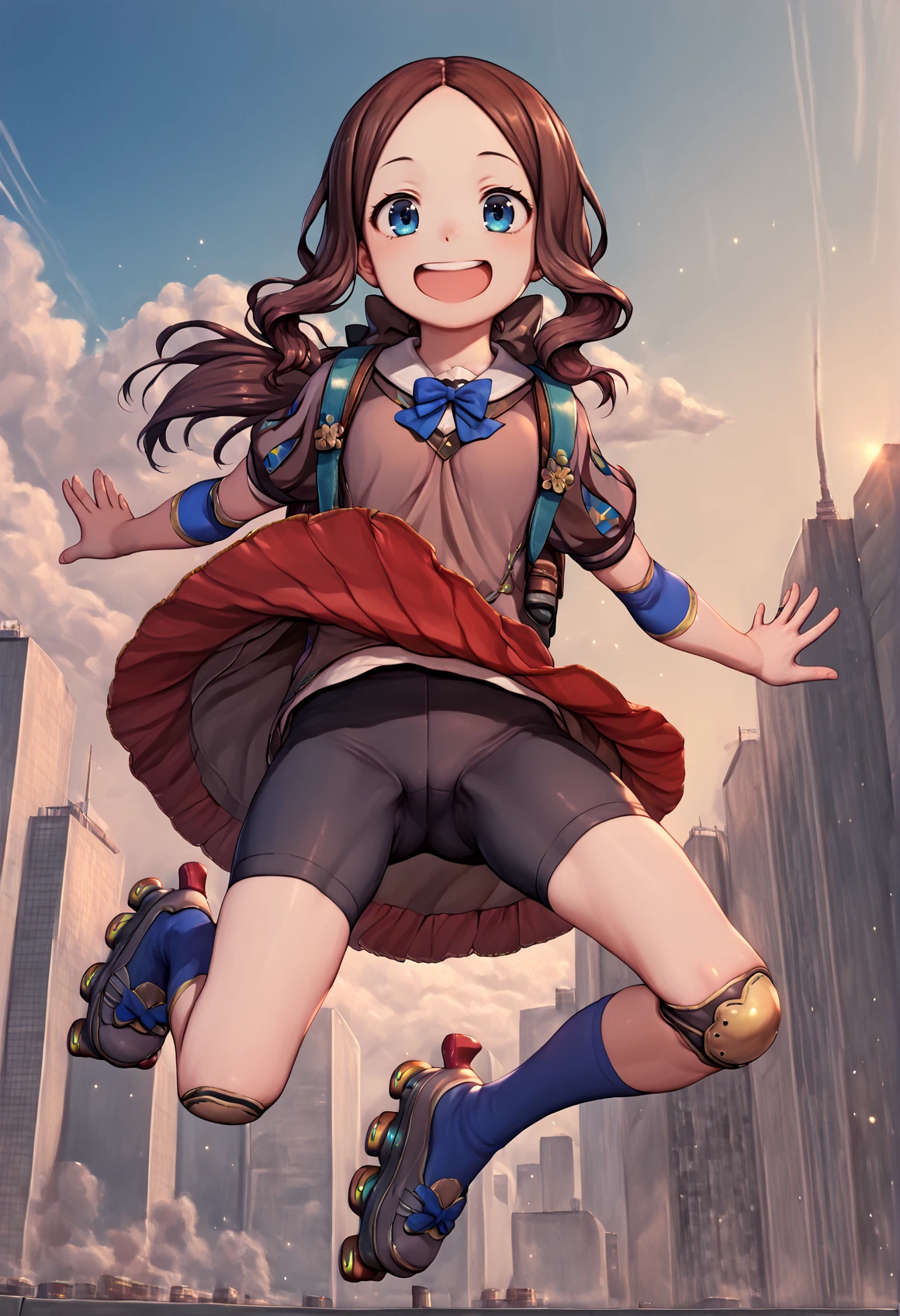 Arcade: low ponytail, ribbon, serafuku, brown shirt, red skirt, blue socks, roller skates, knee pads, backpack, bike shorts