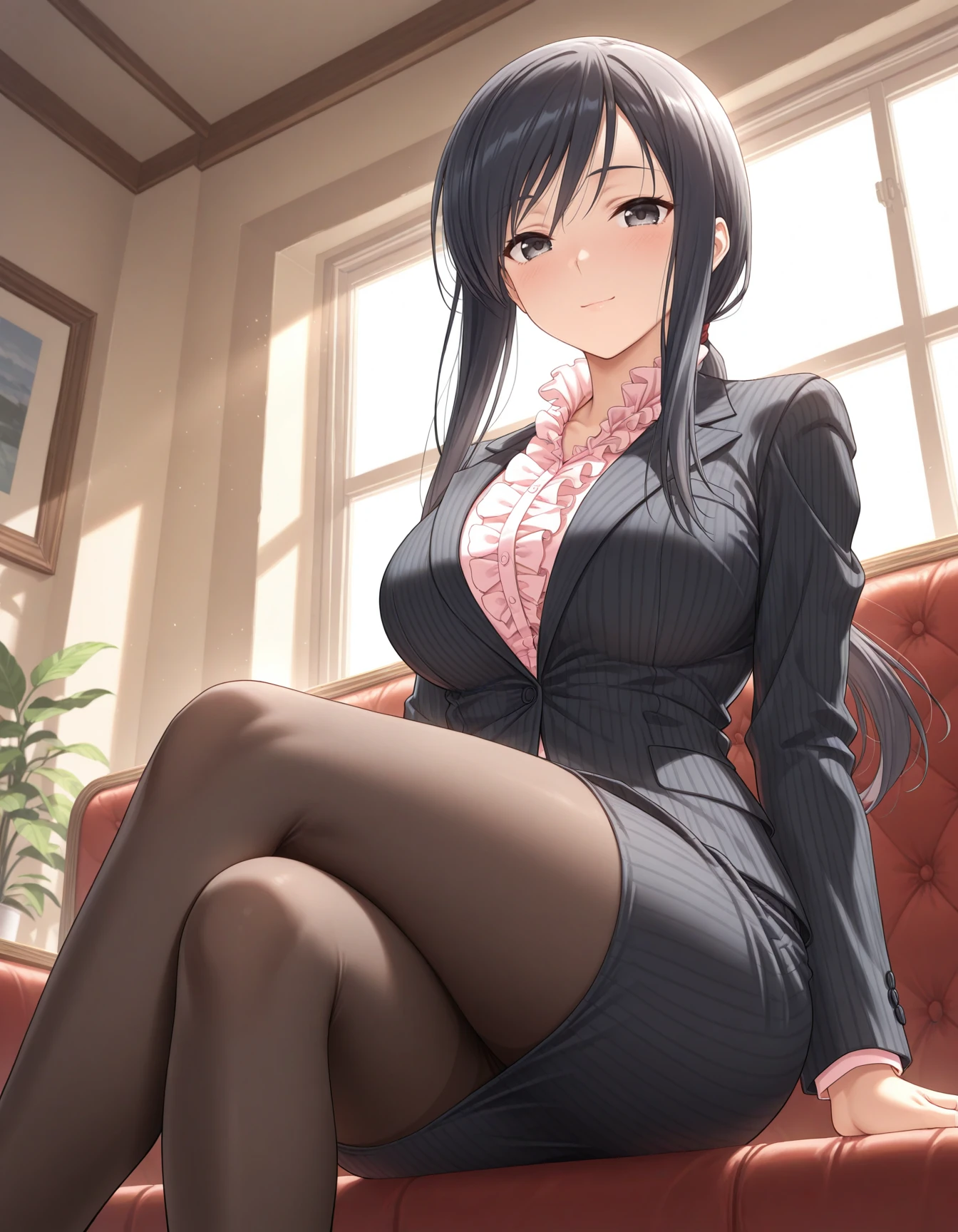 black suit, business suit, pinstripe suit, white shirt, light pink shirt, frilled shirt, pencil skirt, medium skirtDescription