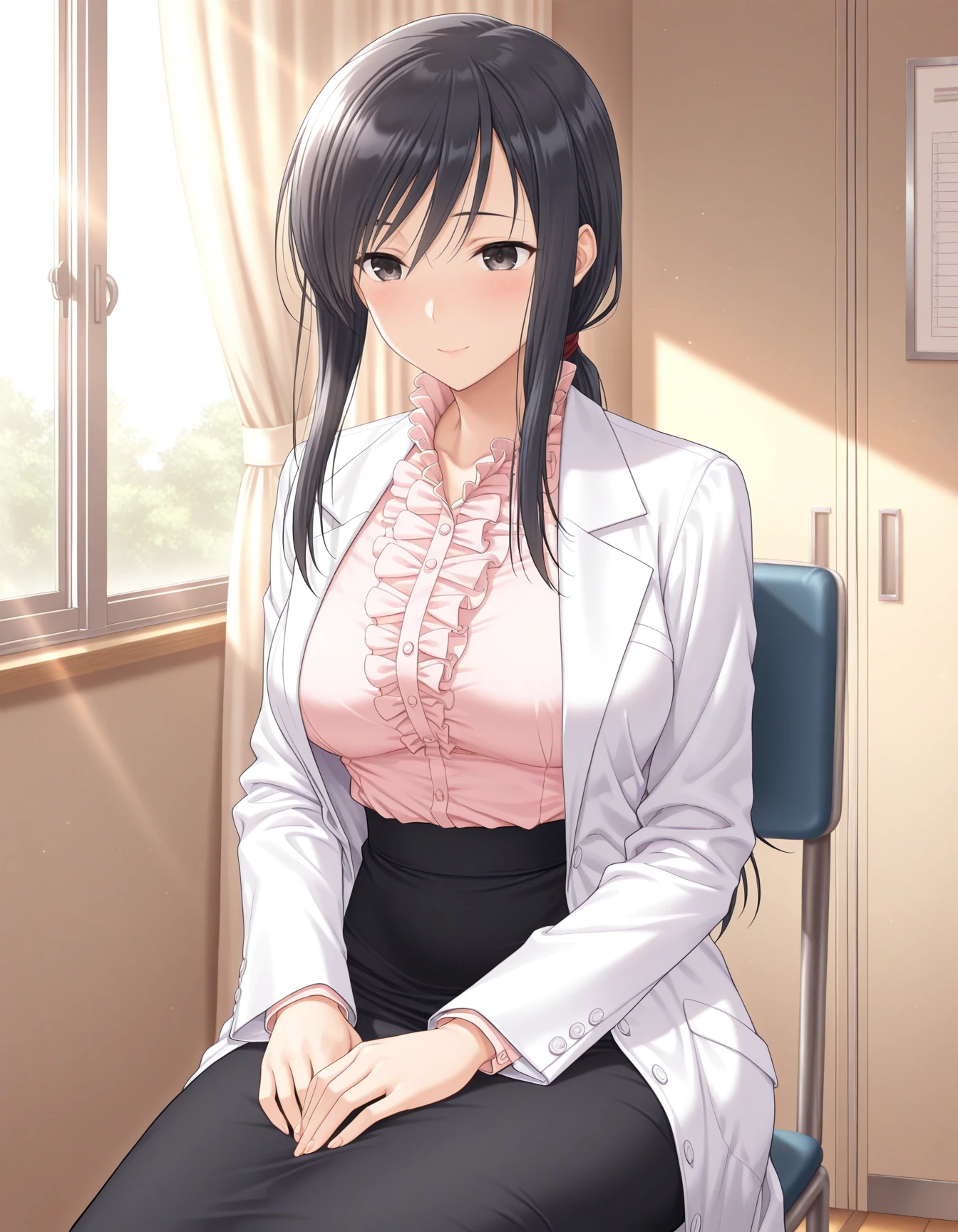 lab coat, light pink shirt, frilled shirt, black skirt, pencil skirt, medium skirtCostume #3 :