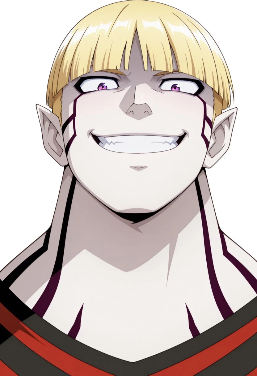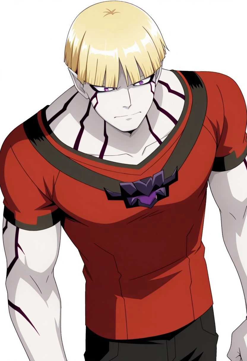 1boy, male focus, pale skin, blonde hair, purple eyes, tattoo, pointy ears, blunt bangs,