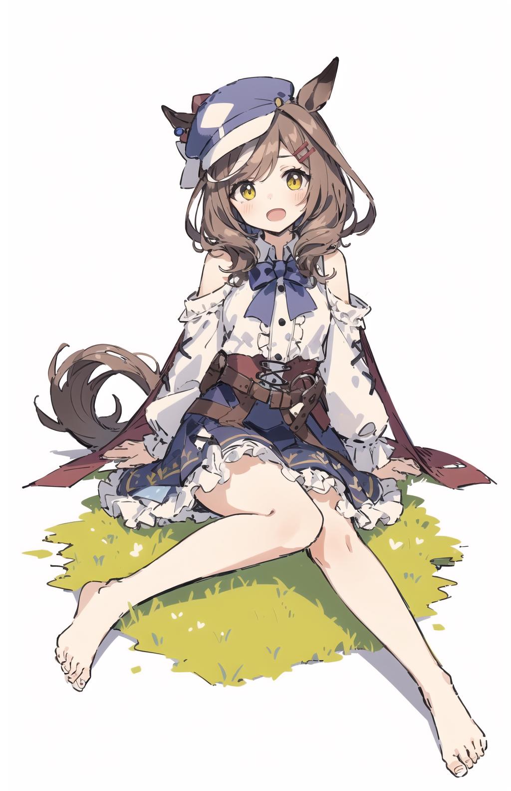 matikane tannhauser (umamusume), animal ears, horse ears,tail, horse tail,boots,brown hair, white shirt, horse girl,hat,long sleeves,hairclip, blue skirt,brown footwear,hair ornament, brown eyes, puffy long sleeves, blue headwear,bow, frills, streaked hair, blue bow, multicolored hair, puffy sleeves, center frills, frilled skirt, bowtie, knee boots, cabbie hat,pouch, ears through headwear, collared shirt, belt, white hair, medium hair,