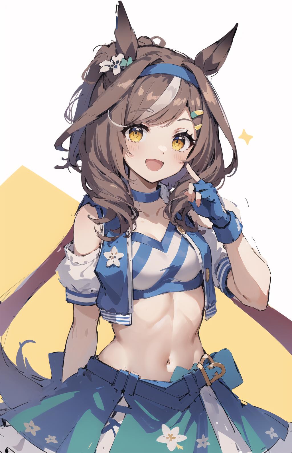 matikane tannhauser (blue turbulence), animal ears, horse ears, tail, horse tail, horse girl, navel, medium breasts,yellow eyes, fingerless gloves, hair ornament, headband, gloves, brown hair, medium hair,  midriff, alternate costume,collarbone, hairclip,