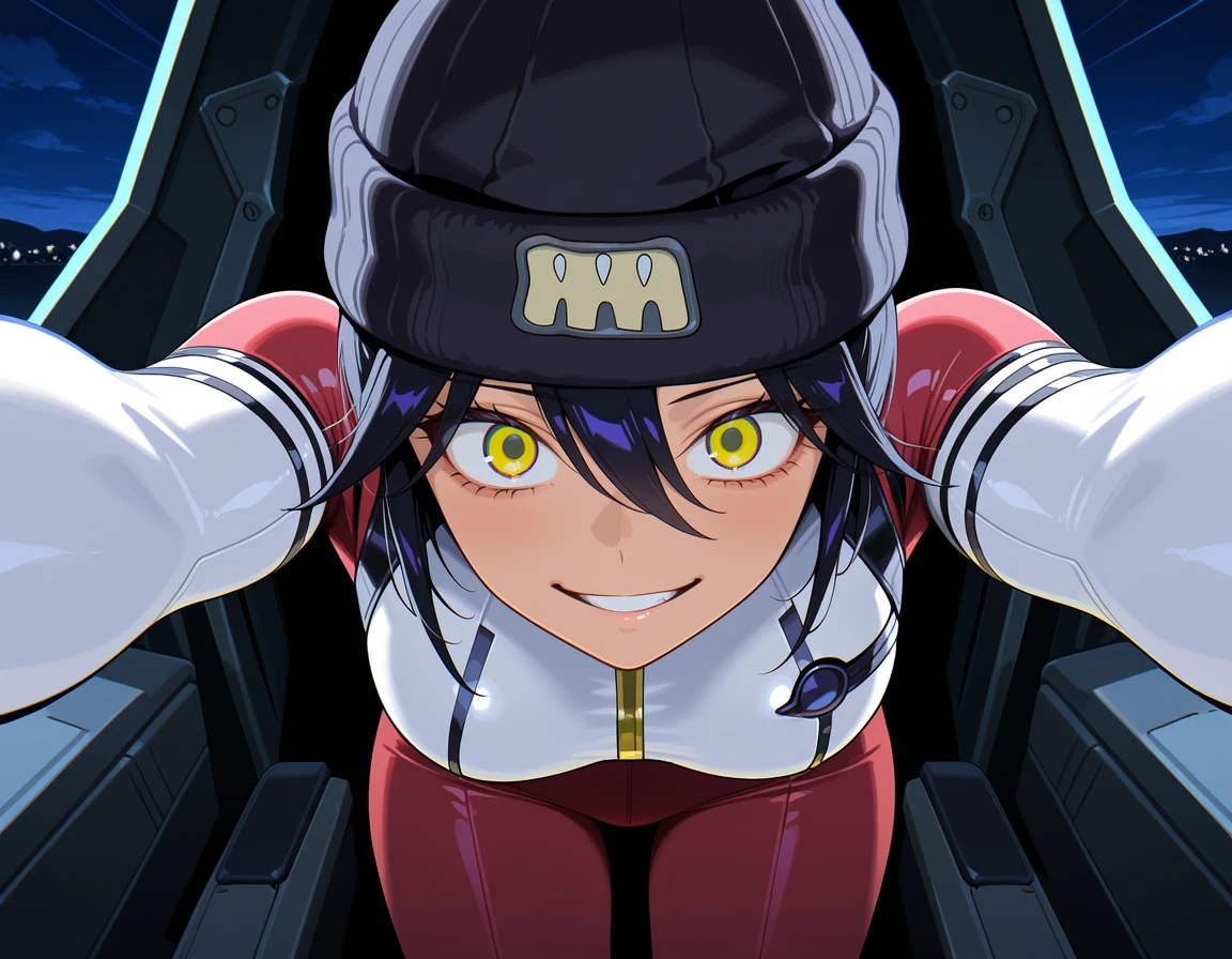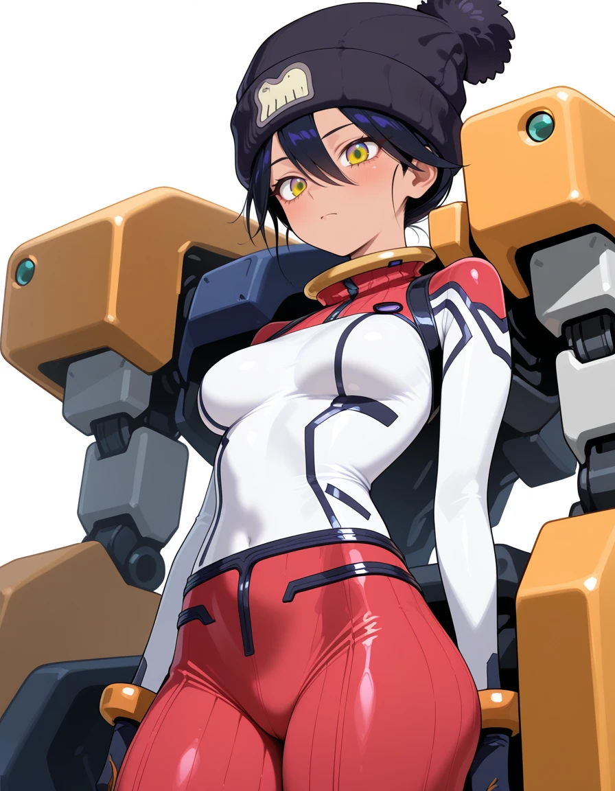 "nyapil, dark skin , black hair, hair between eyes, multicolored eyes, yellow eyes, mecha pilot suit, multicolored bodysuit,gold trim, white bodysuit, red bodysuit,red pants,pom pom beanie,ribbed pants,black headwear, red pants,short hair"