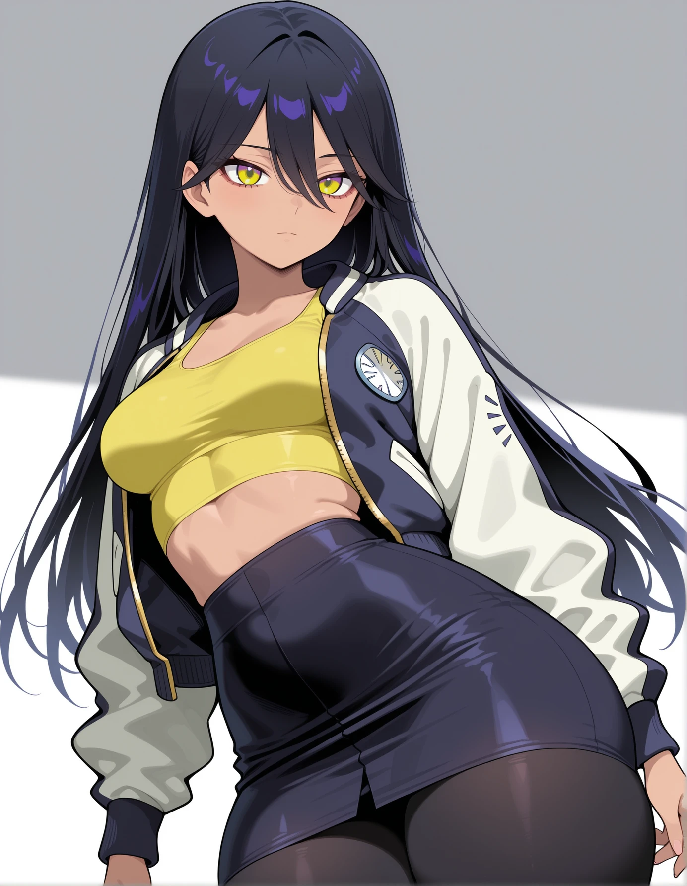 "nyacas, dark-skinned female, dark skin, black hair,long hair,hair between eyes, multicolored eyes, yellow eyes, yellow tank top,black pantyhose,yellow crop top,bomber jacket, multicolored jacket,white jacket,pencil skirt, crop top,black pencil skirt"