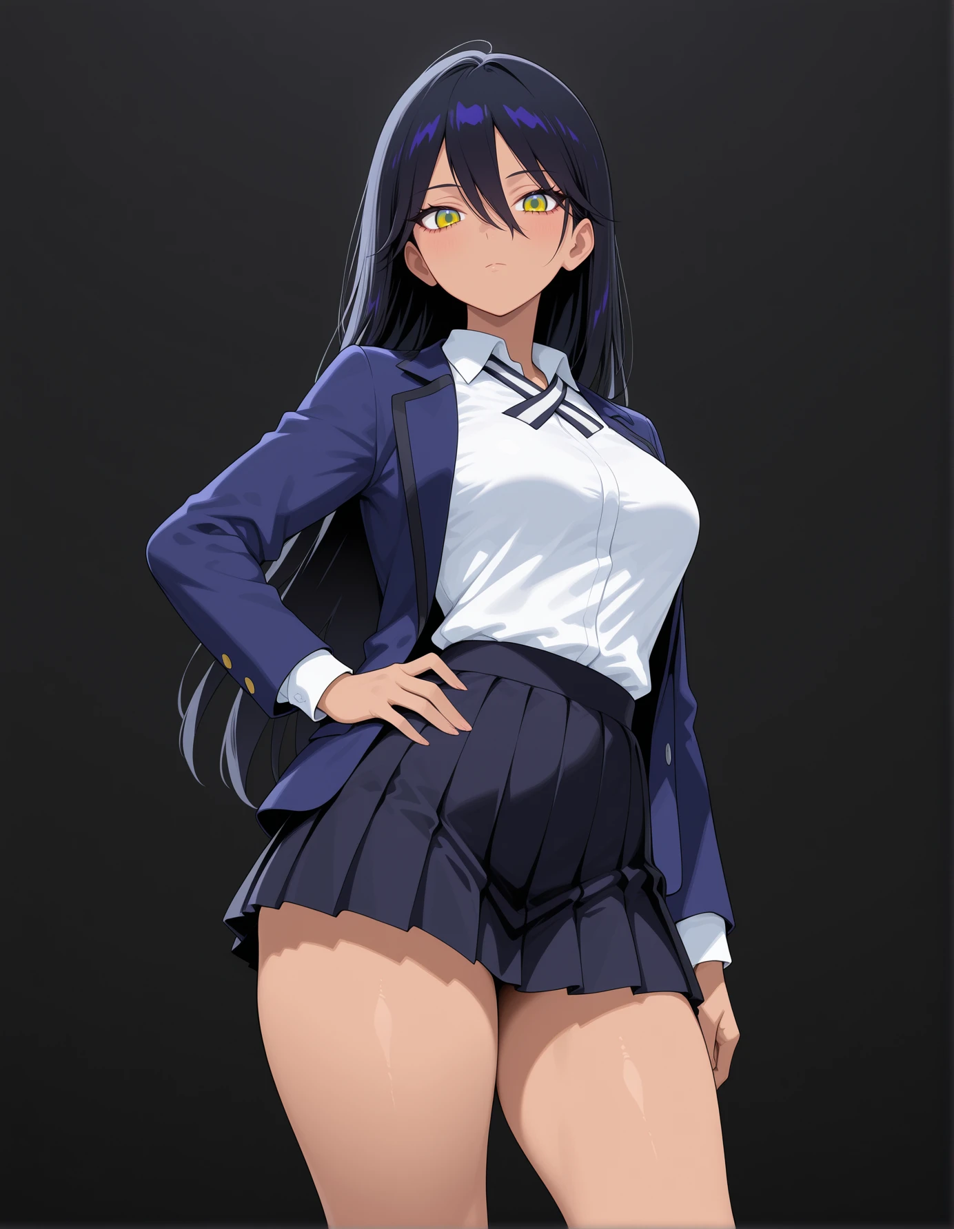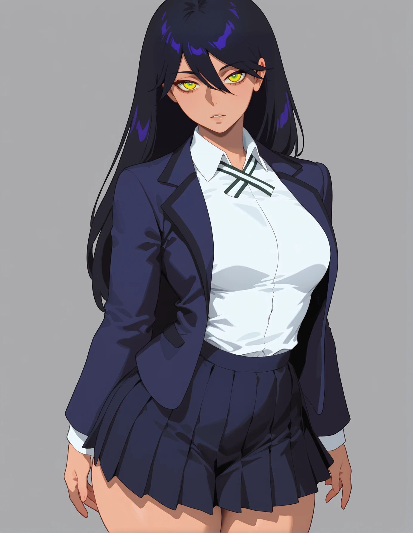 "nyascho,dark-skinned female,dark skin, black hair,long hair,hair between eyes, multicolored eyes, yellow eyes,green eyes,school uniform, pleated skirt, neck ribbon,blazer,looking at viewer, diagonal-striped clothes, white shirt,open jacket"