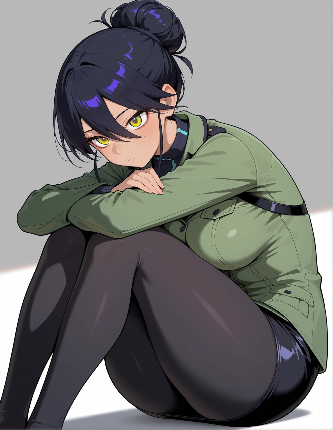 "nyamili ,dark-skinned female, dark skin , black hair,long hair,hair between eyes, multicolored eyes, yellow eyes, military uniform, green jacket,pencil skirt, single hair bun, black pantyhose,short hair,turtleneck sweater,black skirt"
