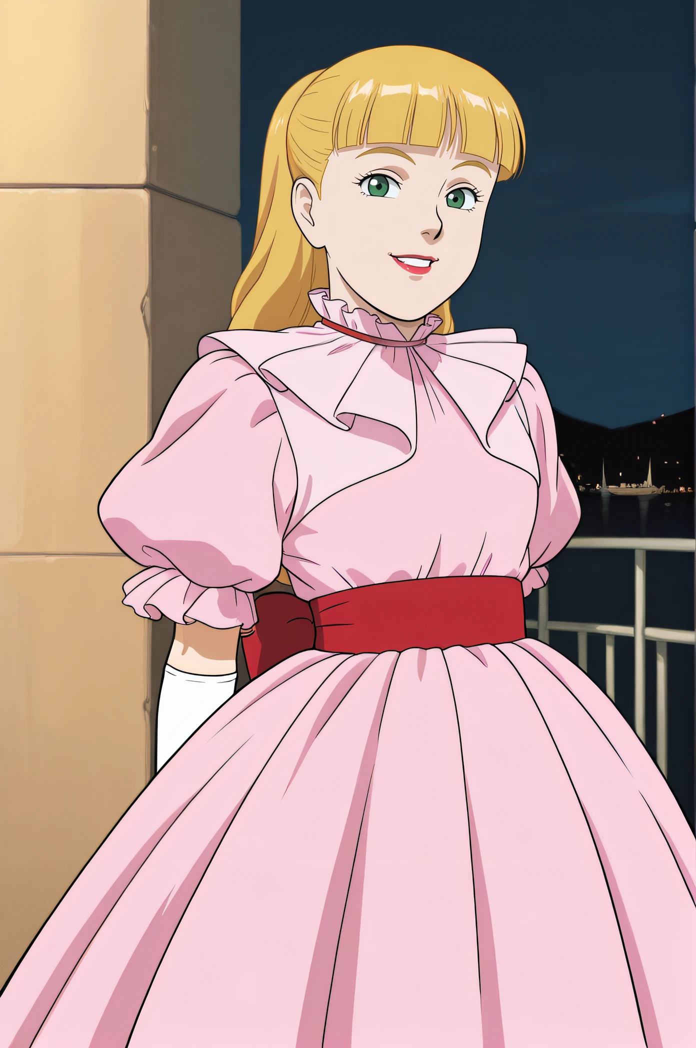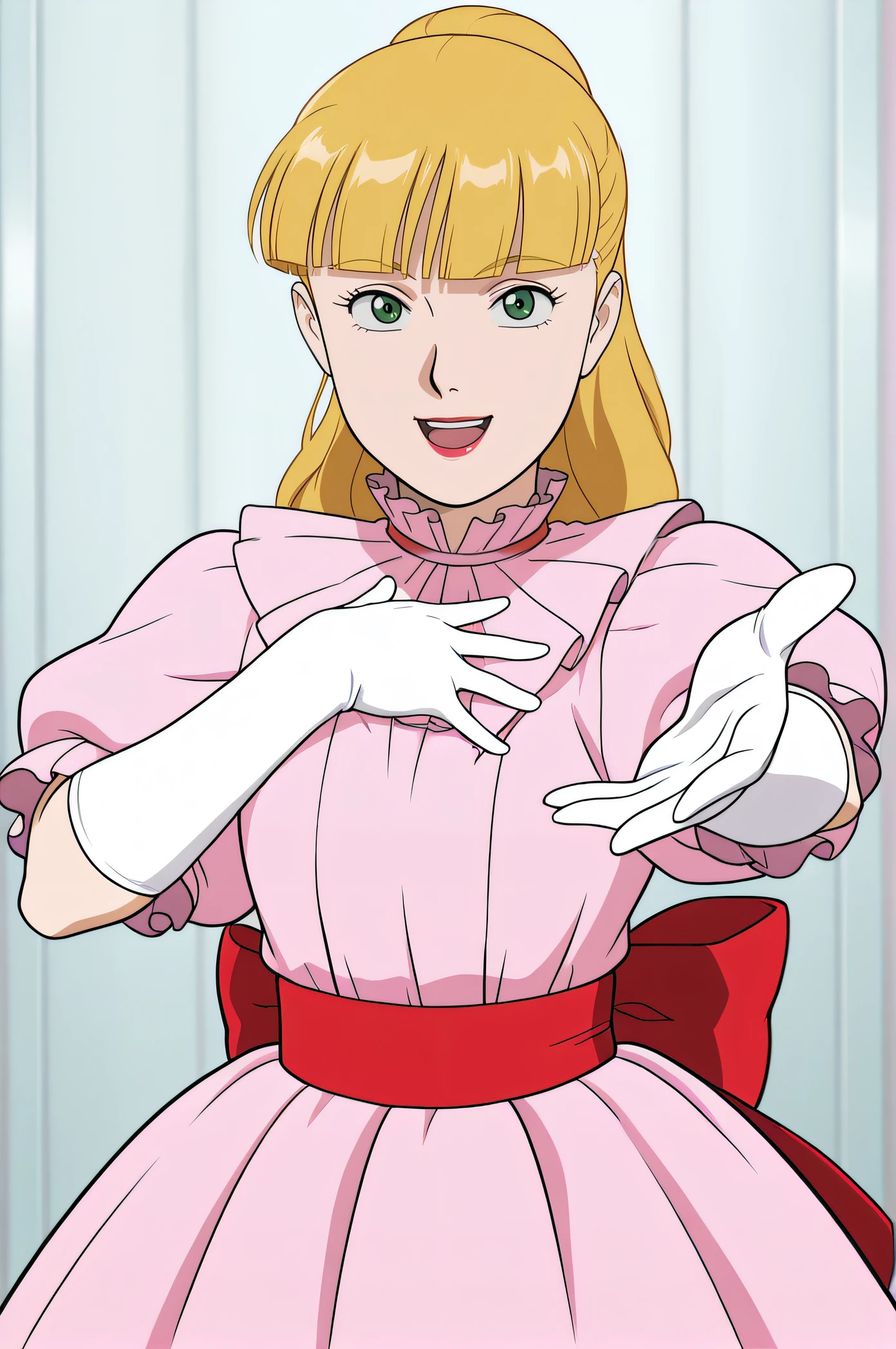 scarlett, blonde hair, ponytail, blunt bangs, green eyes, lipstick, frill collar, pink dress, puffy short sleeves, white elbow gloves, red sash, waist bow, long layered dress