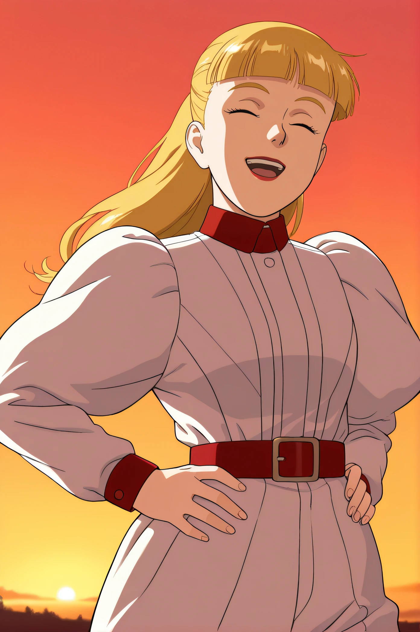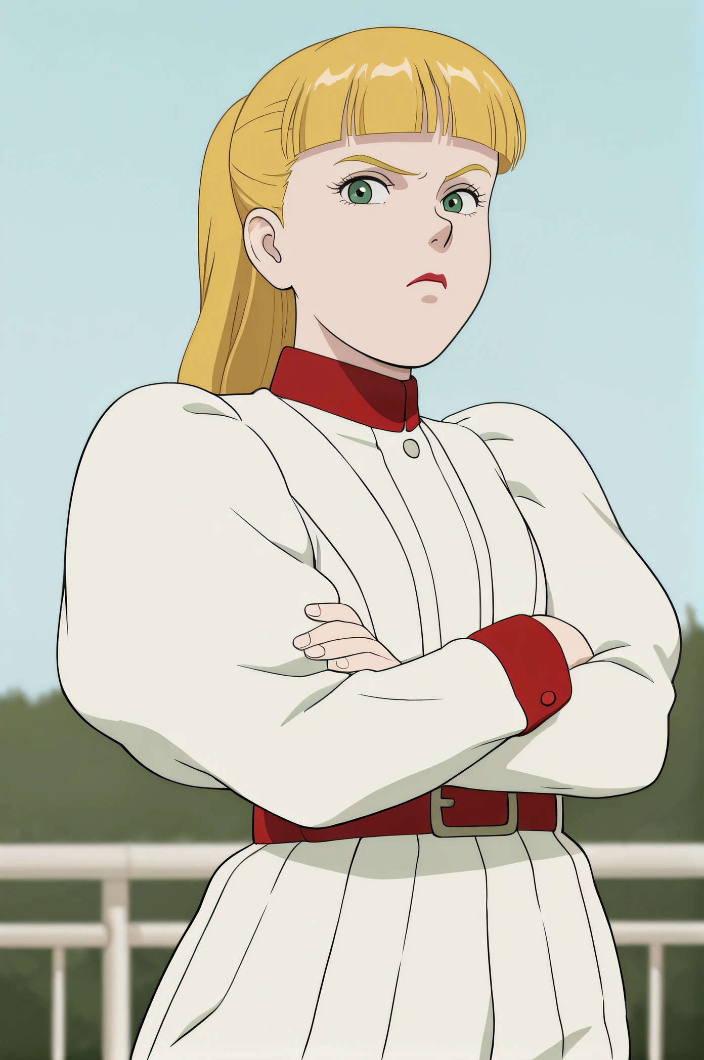 scarlett, blonde hair, ponytail, blunt bangs, green eyes, lipstick, white dress, juliet sleeves, long sleeves, red belt, white pants