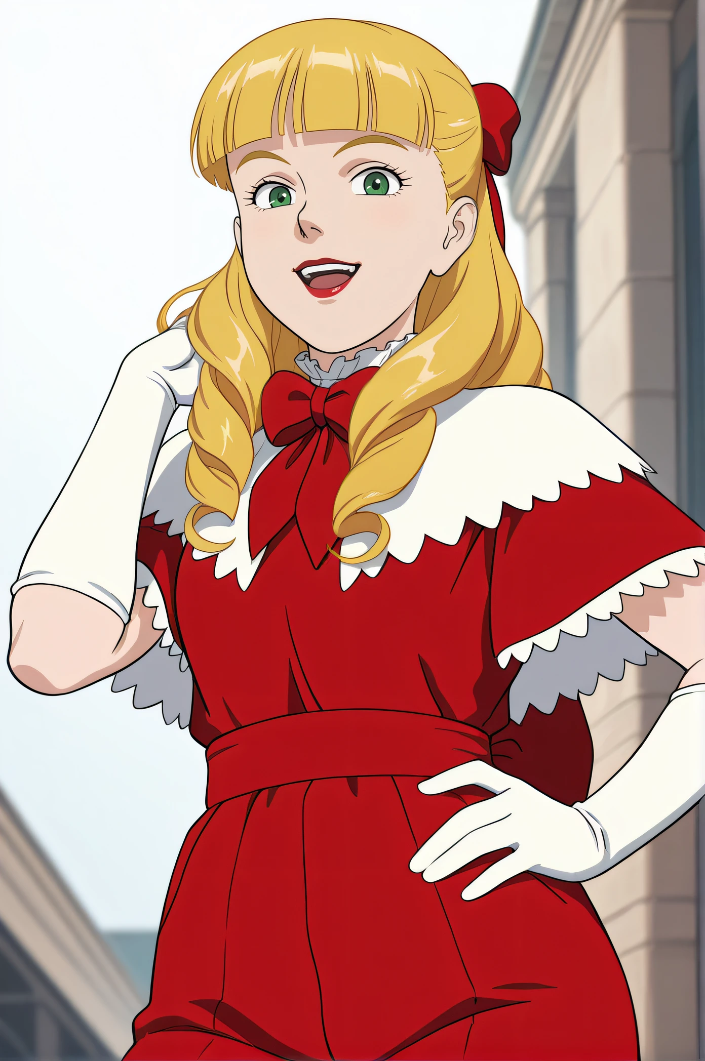 scarlett, blonde hair, drill hair, blunt bangs, green eyes, lipstick, red lips, red bow, red dress, white frilled capelet, white elbow gloves, red pants