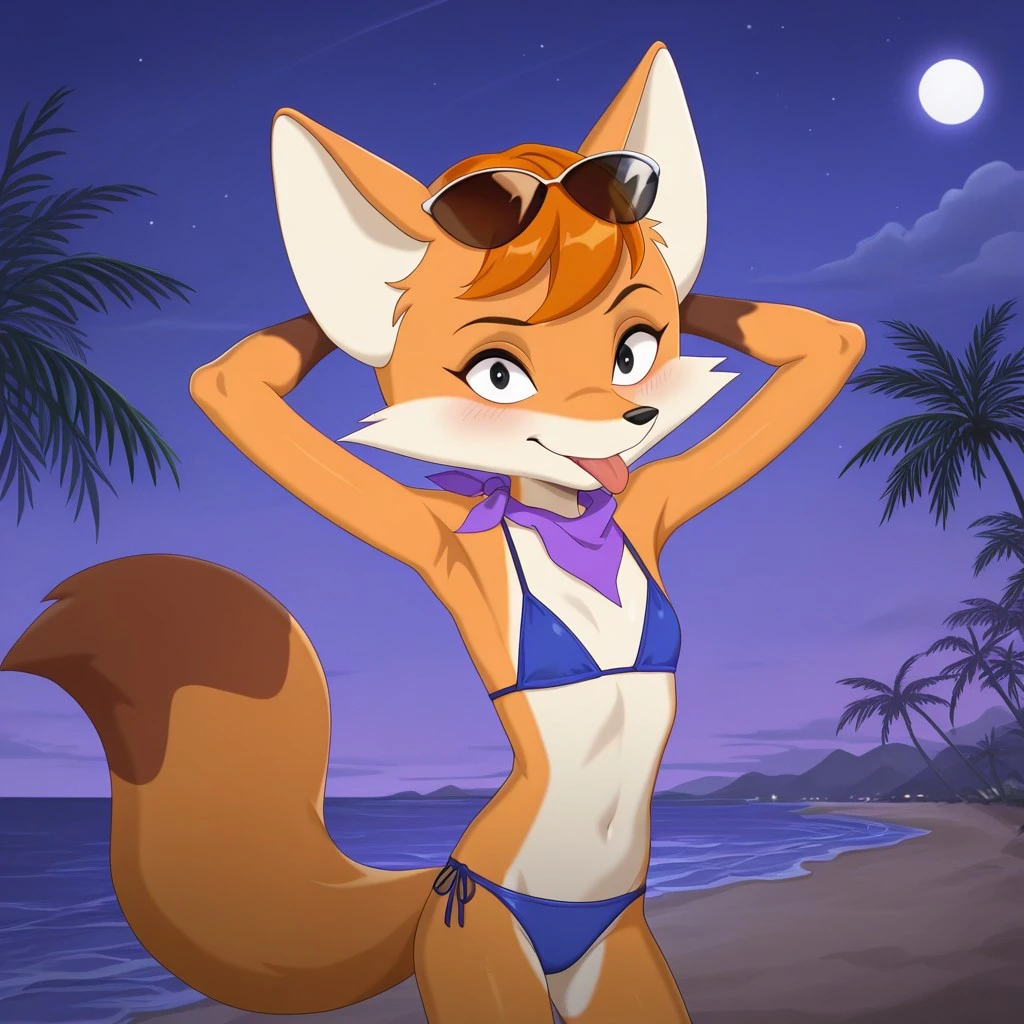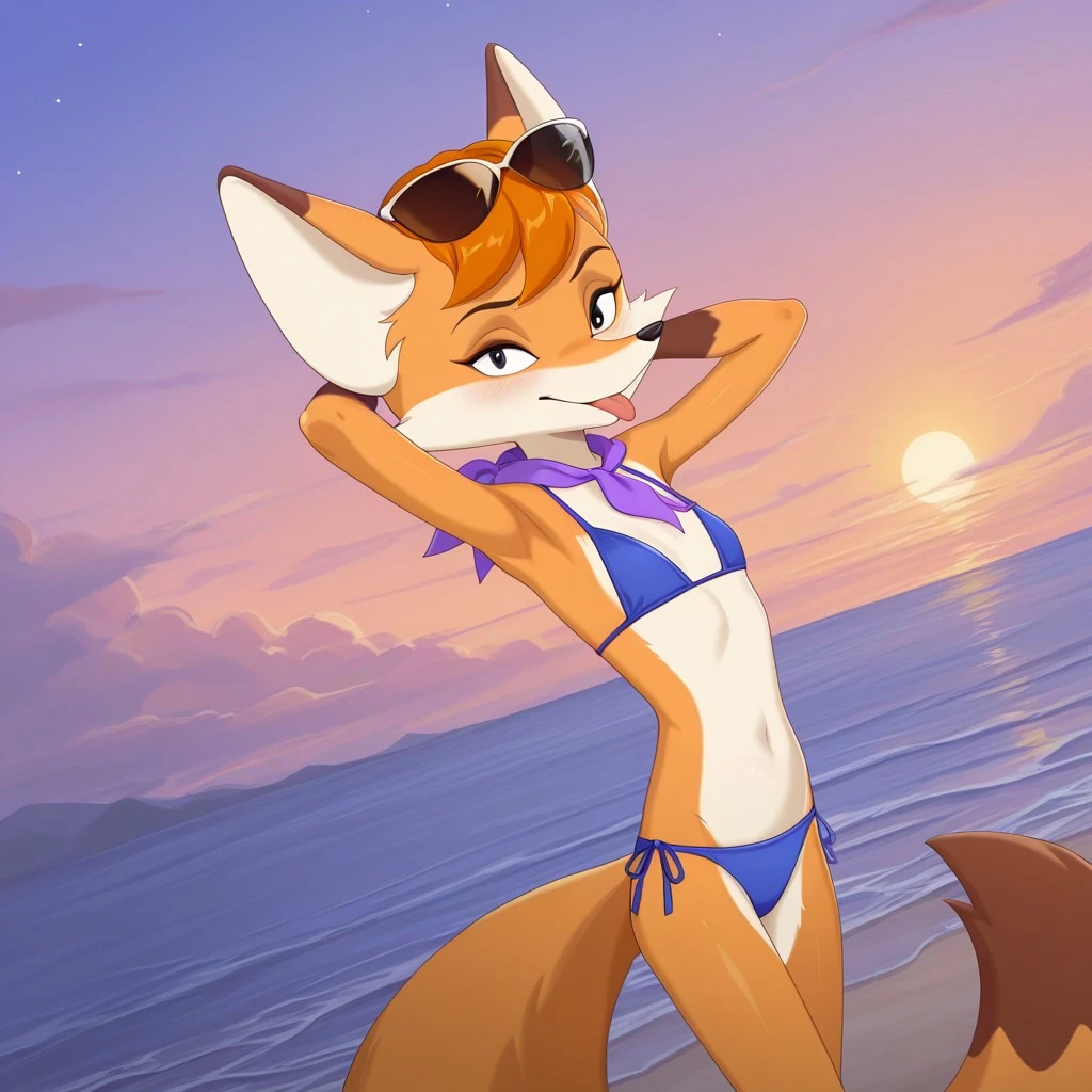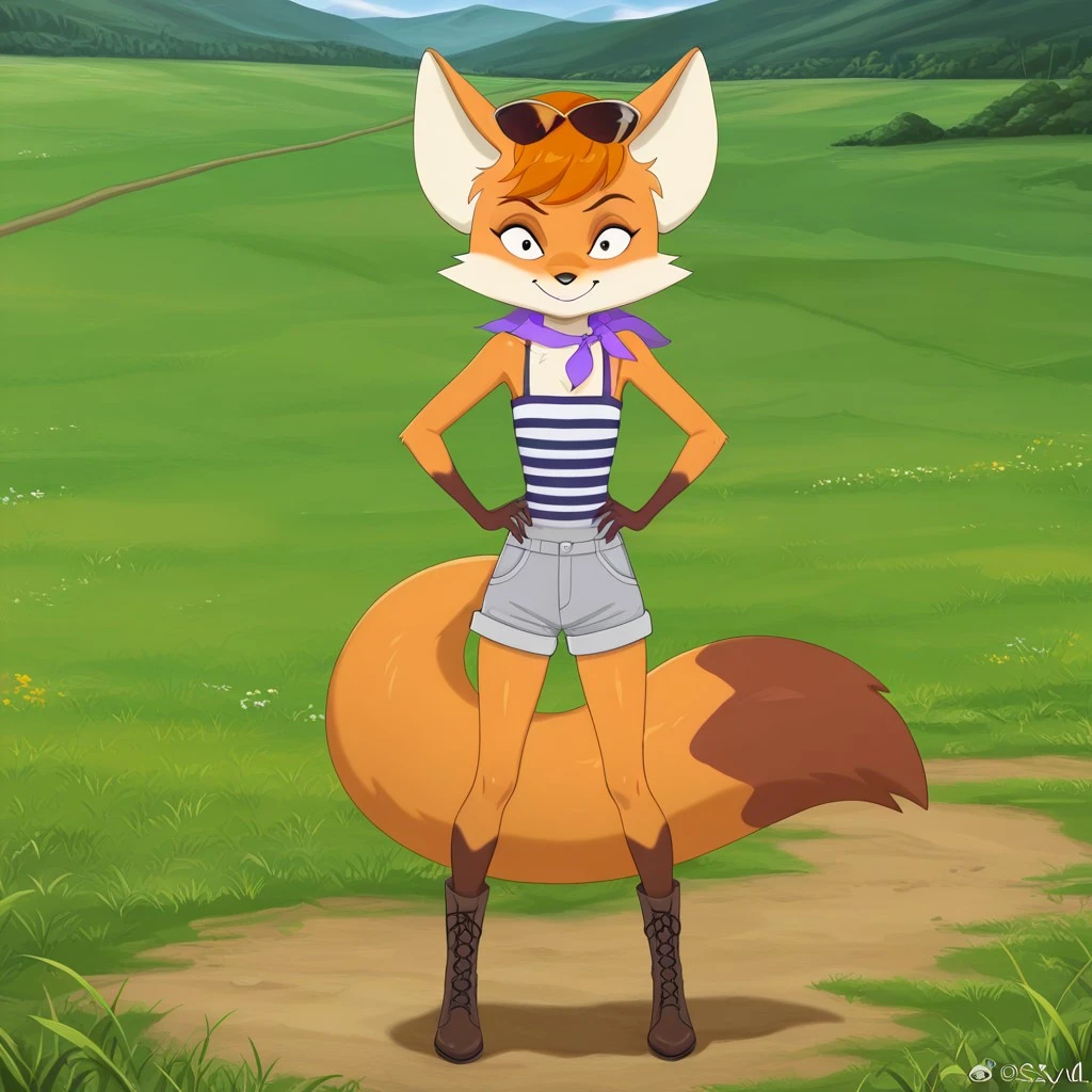 fox, fox girl, orange and tan fur, orange hair, black eyes, black nose, fox ears, bushy fox tail, brown hands, slim body, flatchested, sunglasses on head, purple neckerchief, blue and white striped top, denim shorts, brown heeled boots,