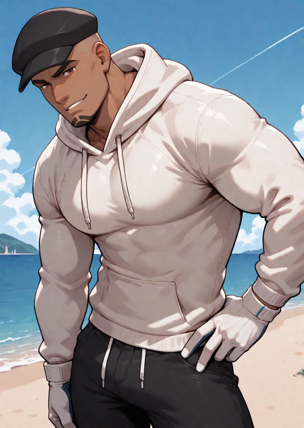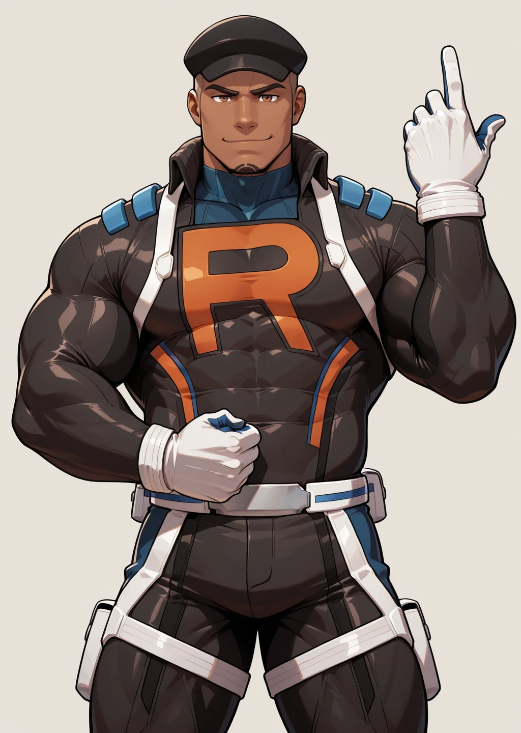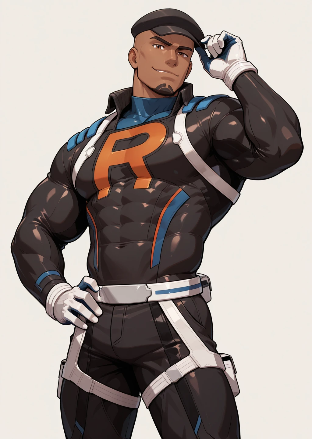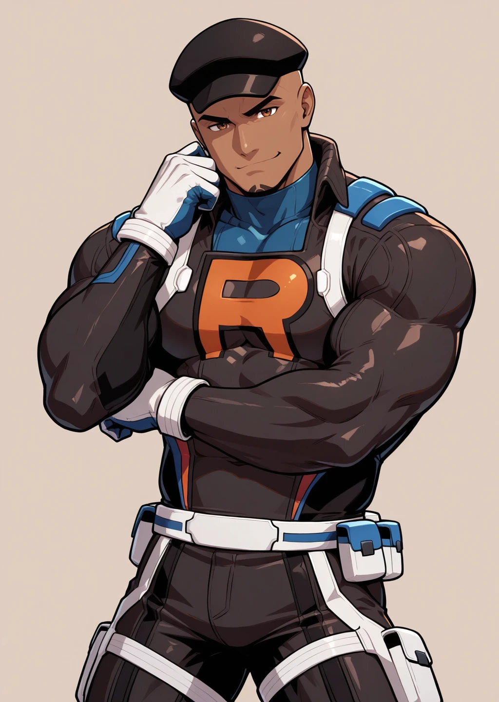 cliffpokemon, black bodysuit, white gloves, long pants, dark skin, muscular, bara, cowboy shot, brown eyes, pose, smirk, black headwear, looking at viewer, simple background, long sleeve