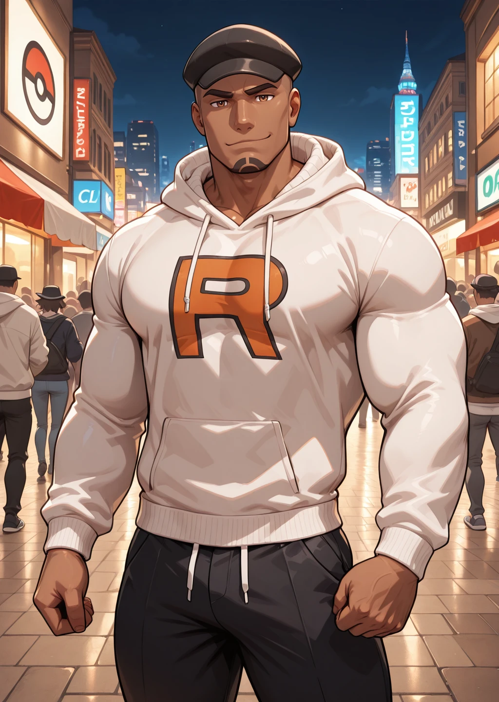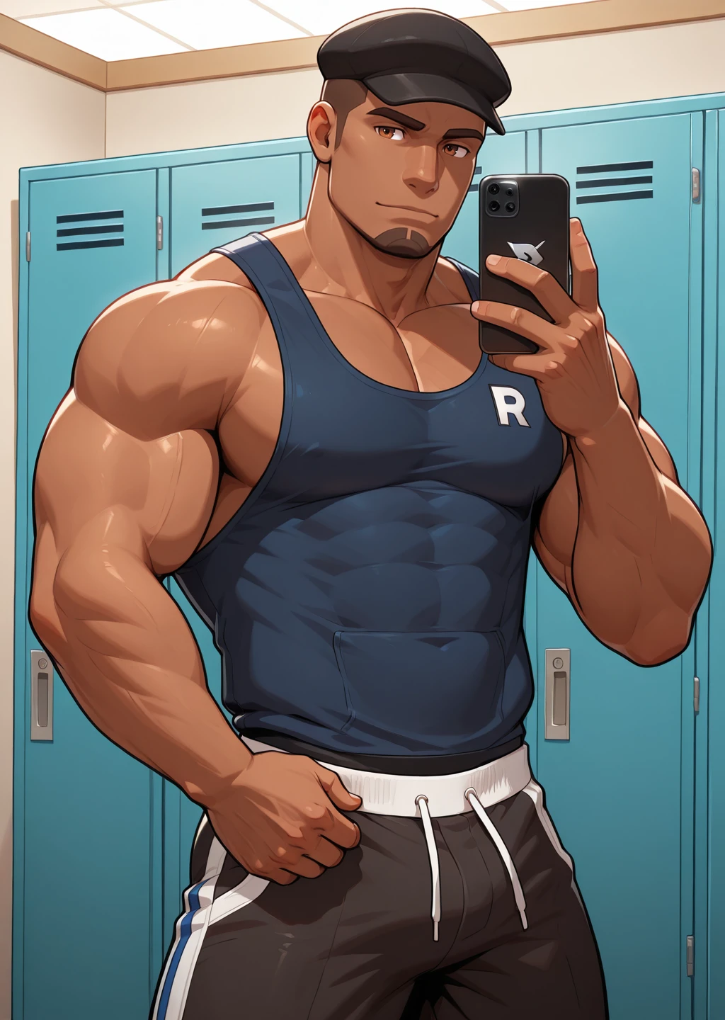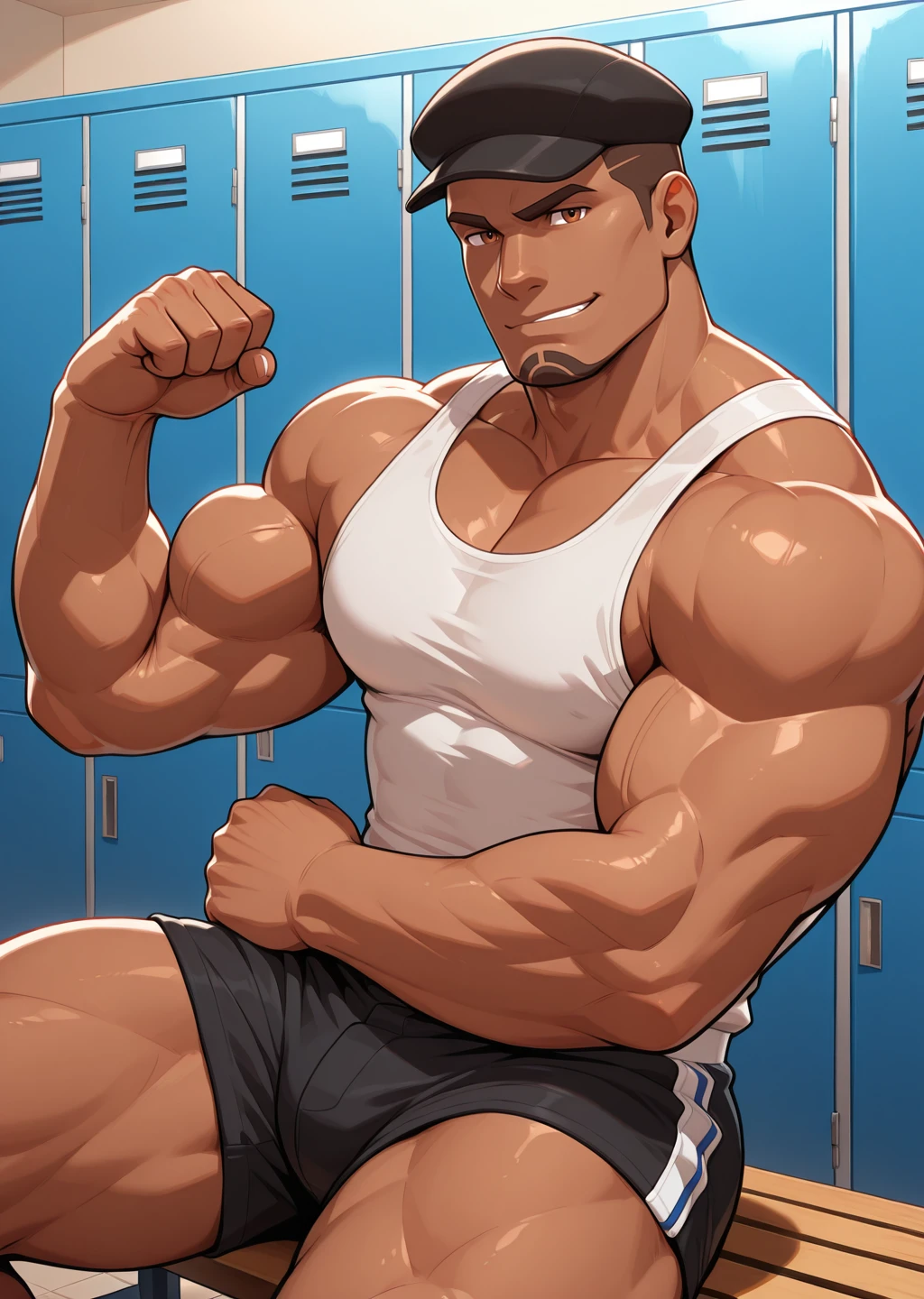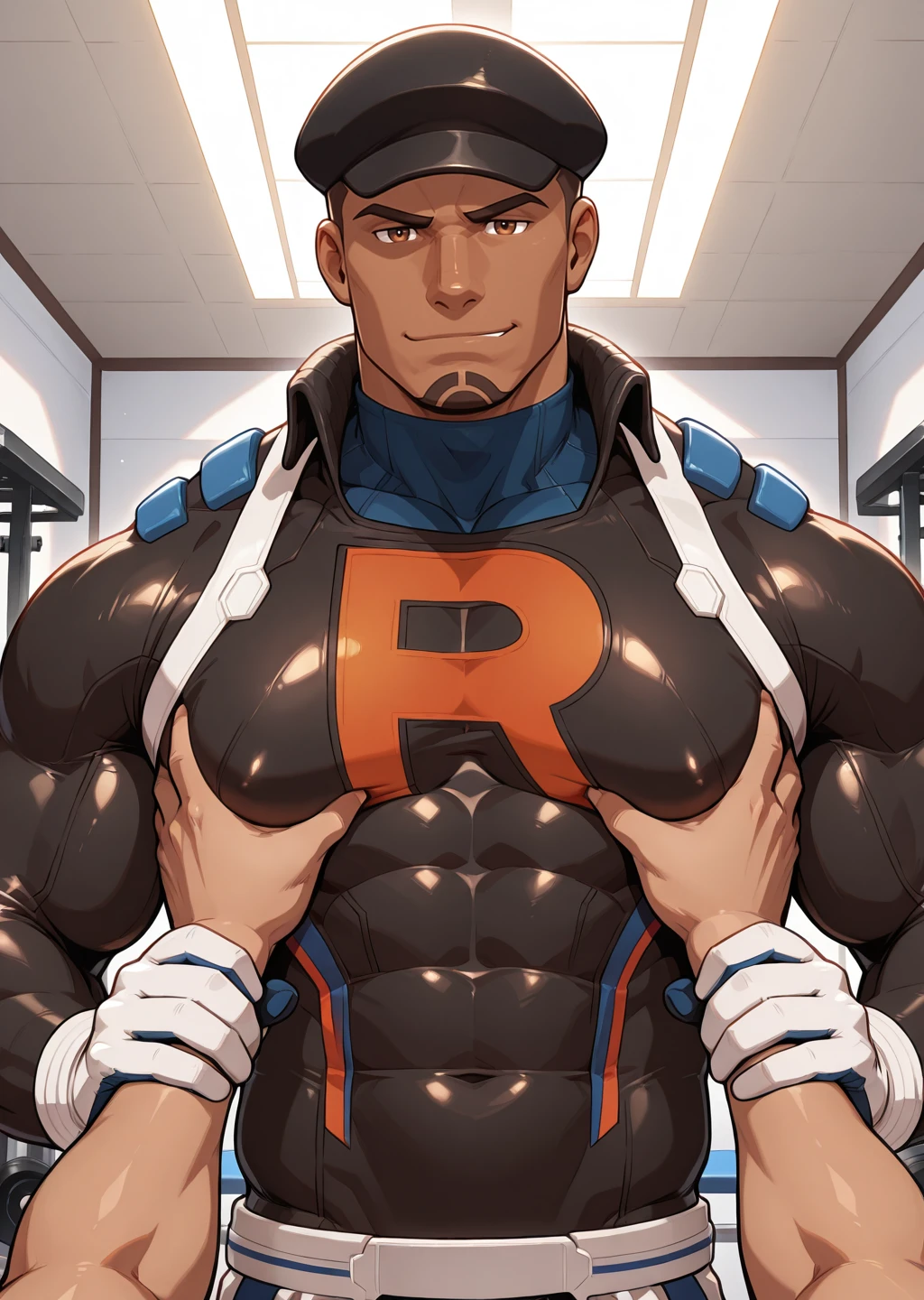 cliffpokemon, black bodysuit, white gloves, long pants, dark skin, muscular, bara, cowboy shot, brown eyes, pose, smirk, black headwear, looking at viewer, simple background, long sleeve