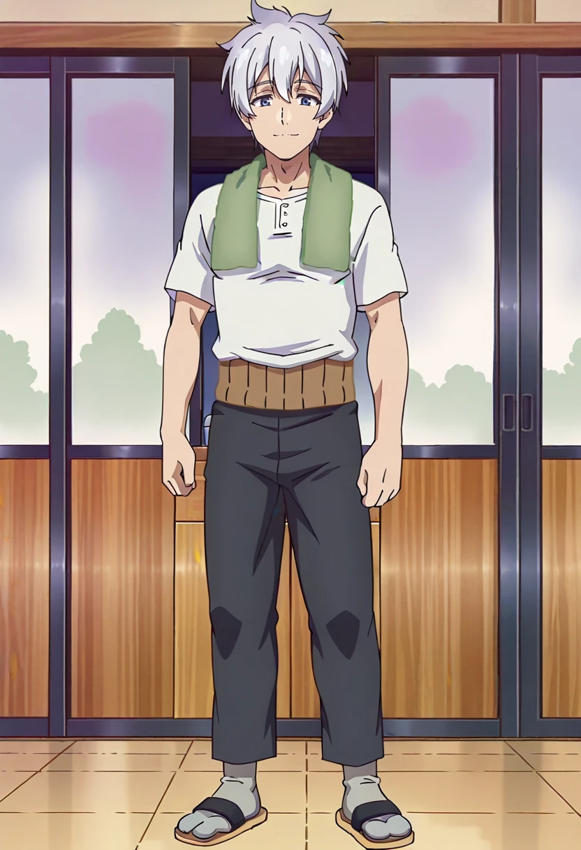 Shozo, Ojisan, 1boy, solo, grey_hair, blue_eyes, white_shirt, green_towel_around_neck, core_warmer, black_pants, black_sandals, socks