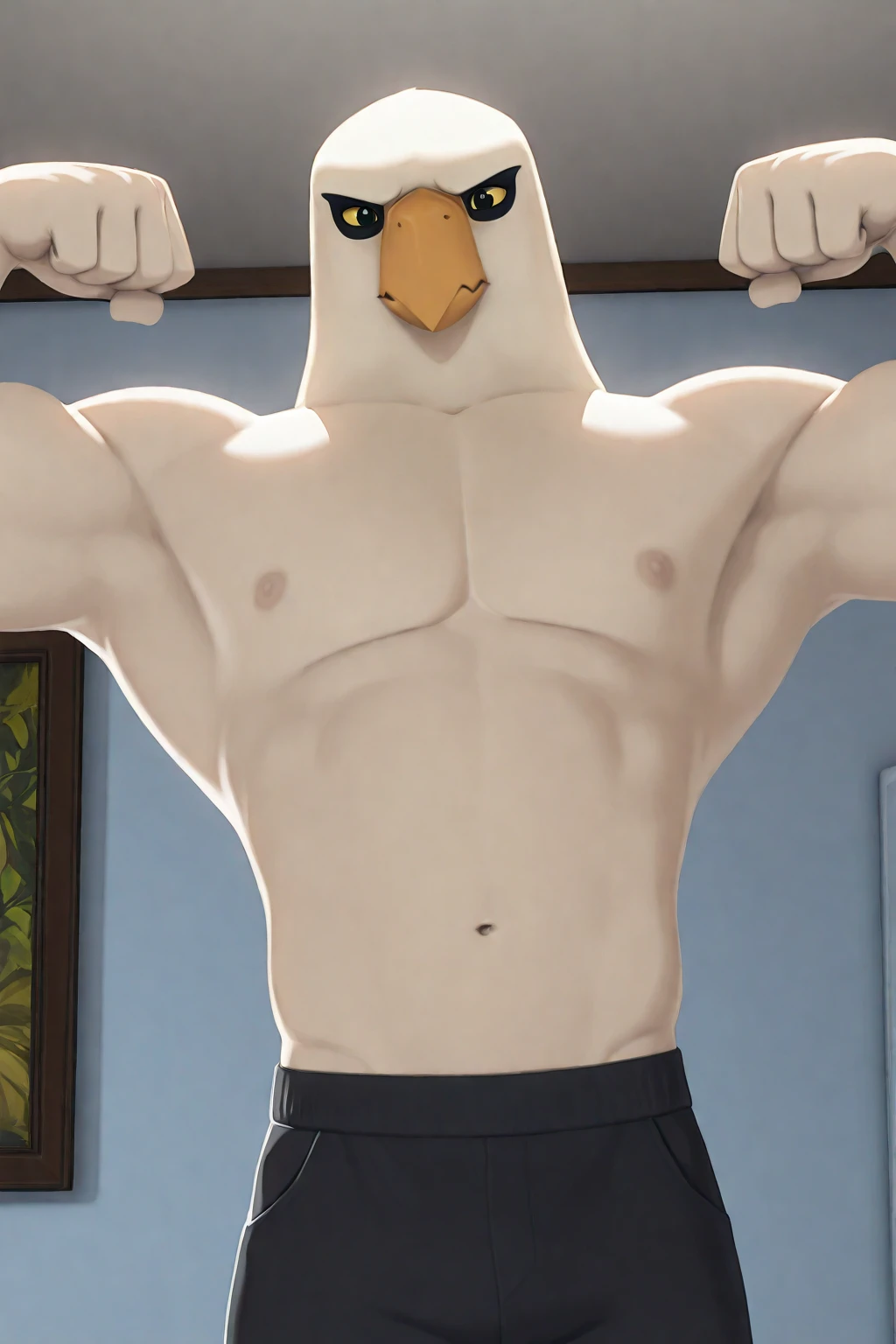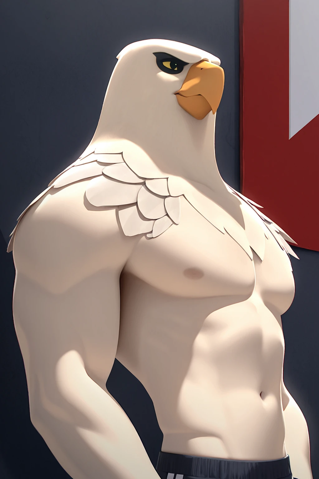 black eyes, falcon, broad shoulders, athletic build, white feathers, two dark patches around eyes, orange beak, yellow sclera, gray suit, gray pants, black button up shirt underneath, black shoes