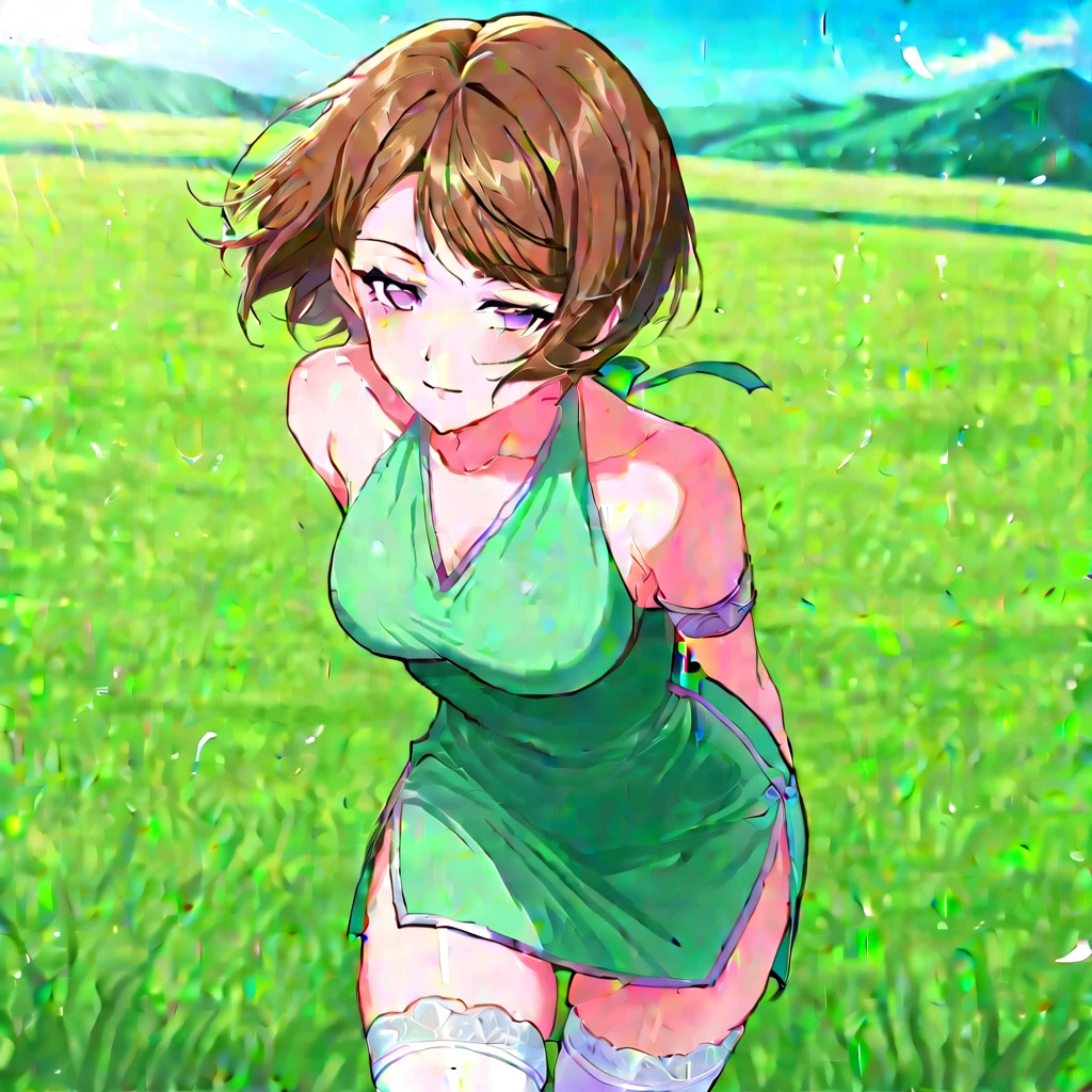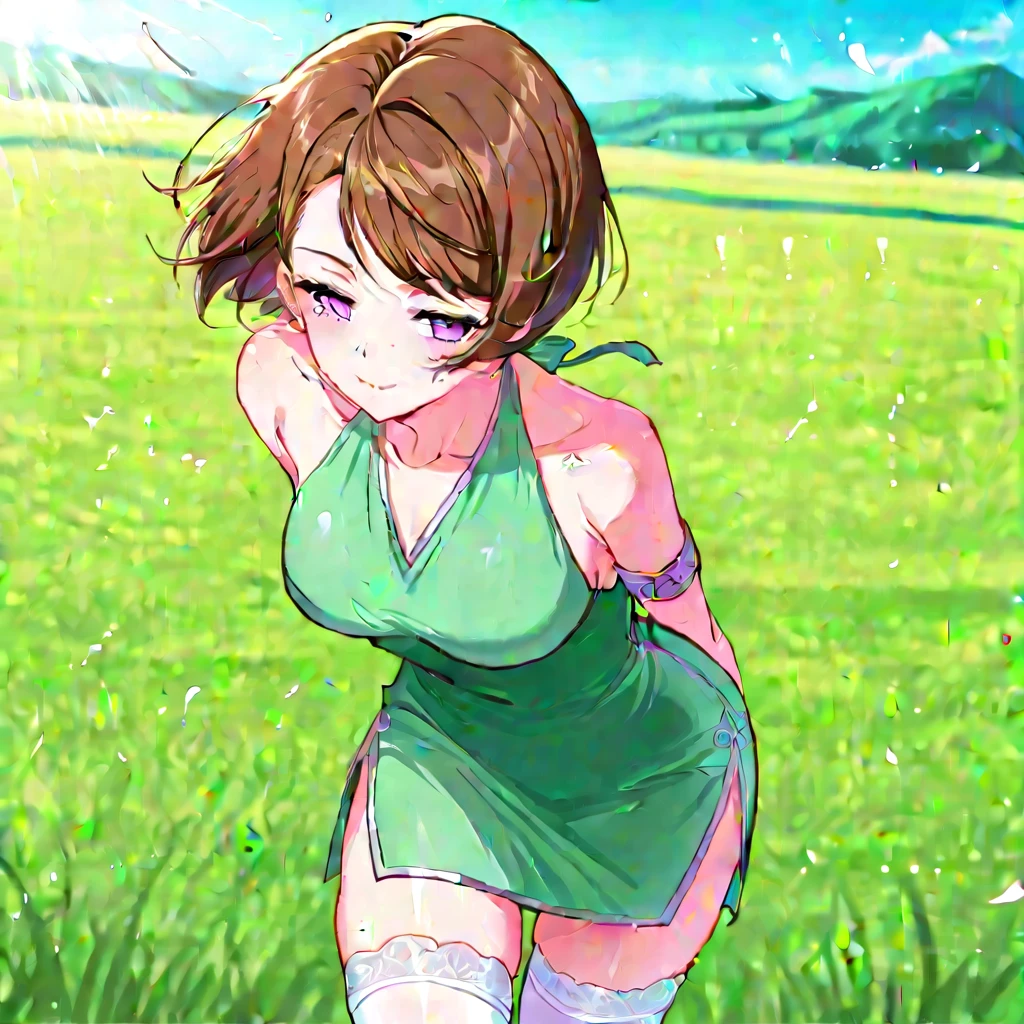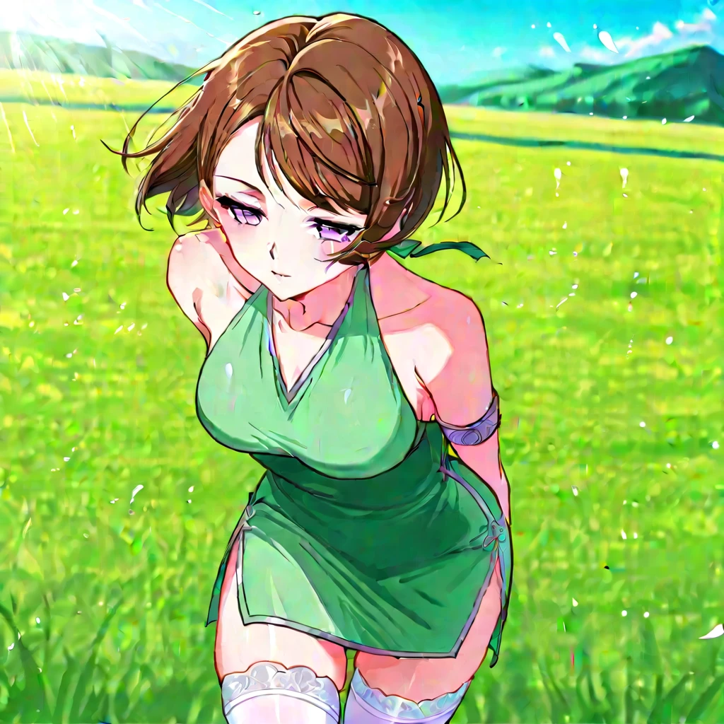 meng, 1girl, solo, short hair, brown hair, side swept bangs, purple eyes, tight green dress, sleeveless dress, halter neck, side slit dress, silver trim details, white thigh high stockings, green shoes, armband on upper arm, white bracelete, shoulders,