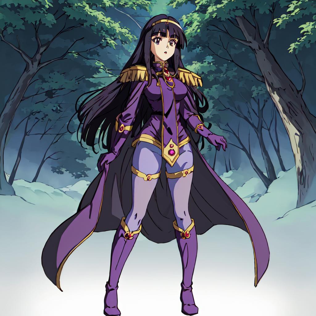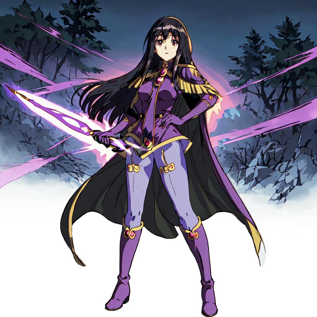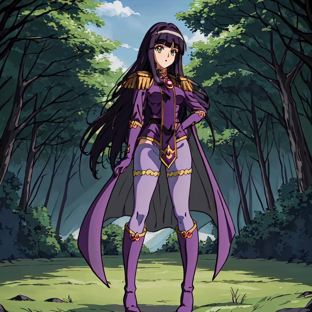 Sylphiel_Nels_Lahda, 1girl, solo, long hair, black hair, pantyhose, cape, knee boots, purple gloves, purple footwear,epaulettes,blunt bangs,green eyes