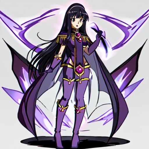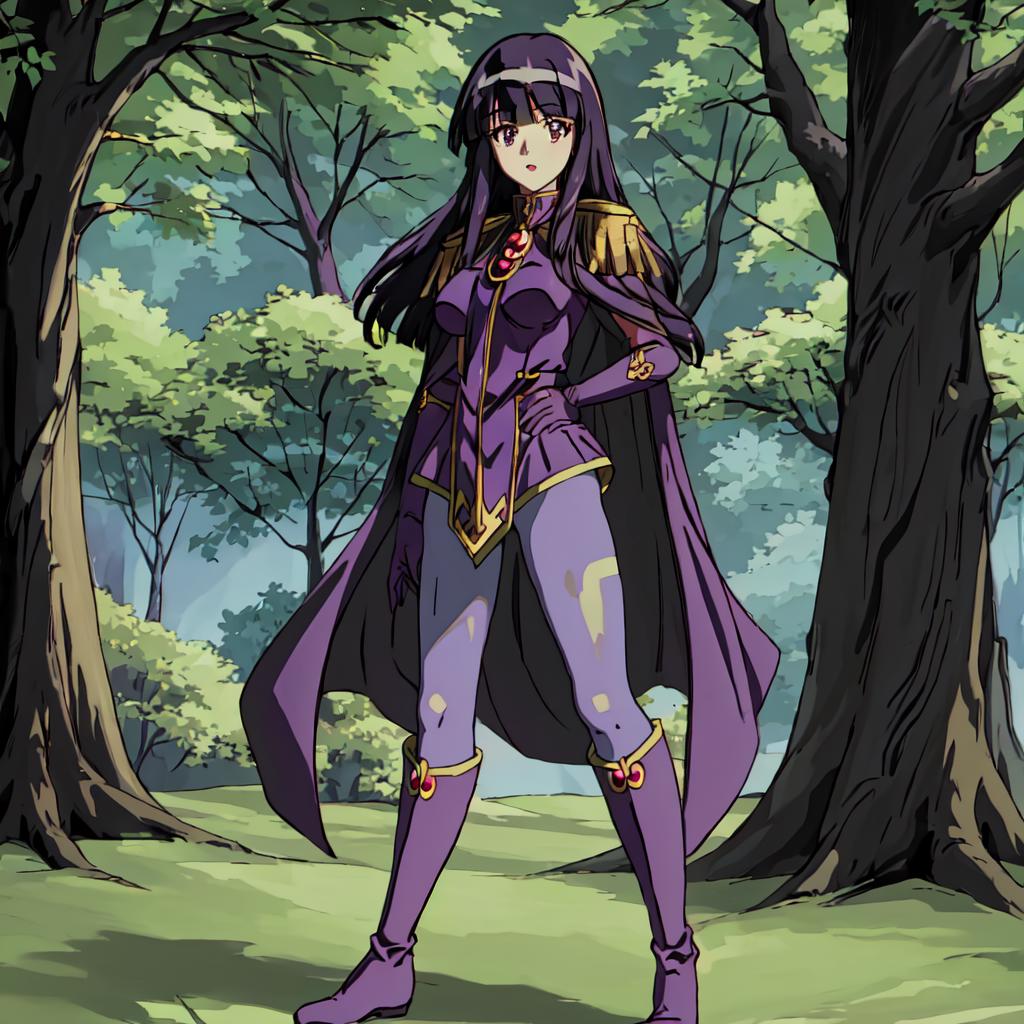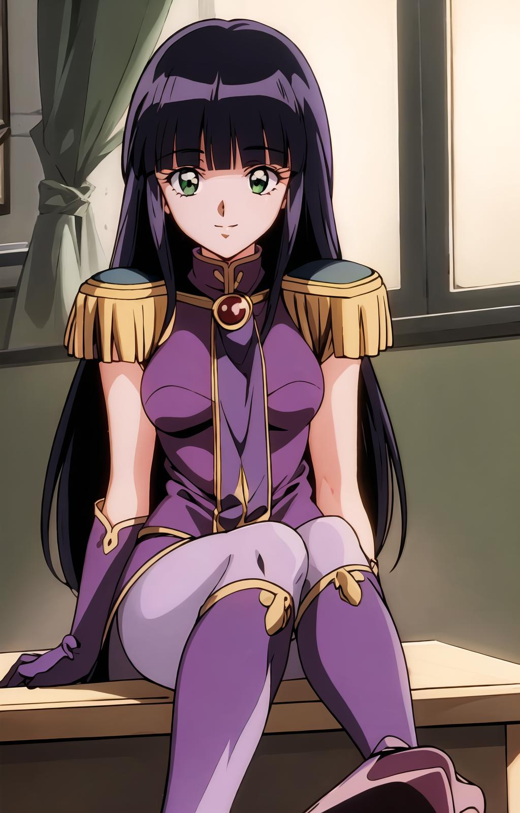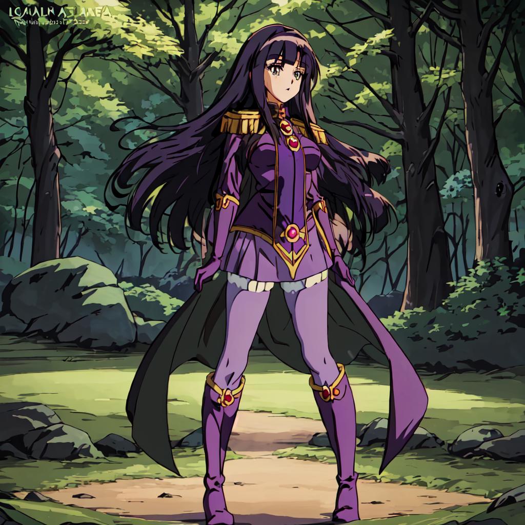 Sylphiel_Nels_Lahda, 1girl, solo, long hair, black hair, pantyhose, cape, knee boots, purple gloves, purple footwear,epaulettes,blunt bangs,green eyes