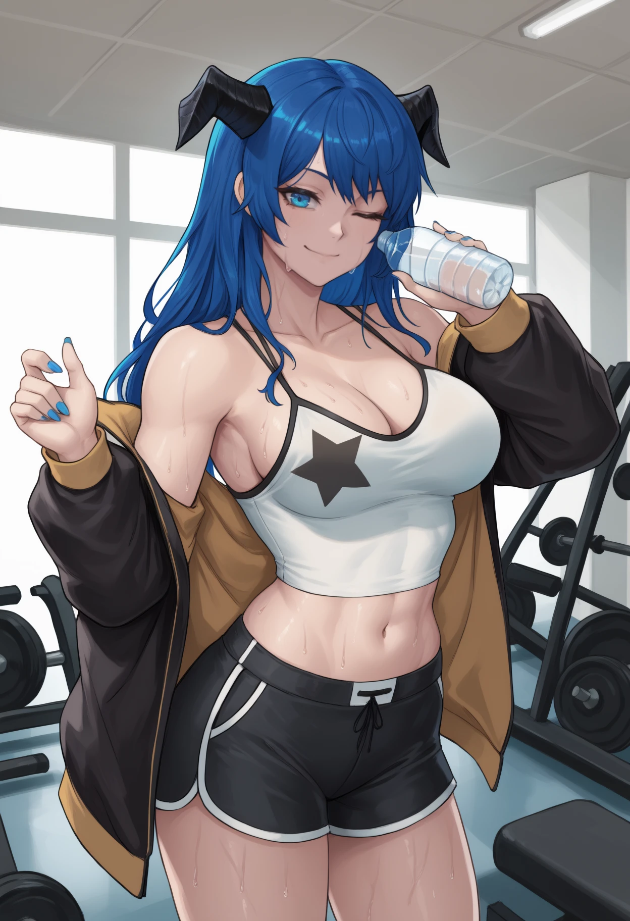 Sports: most1masports, long hair, blue hair, black horns, demon horns, blue eyes, two-sided jacket, black jacket, open jacket, off shoulder, long sleeves, white camisole, crop top, spaghetti strap, star print, black shorts, dolphin shorts, short shorts, blue nails, bare shoulders, stomach, navel, cleavage