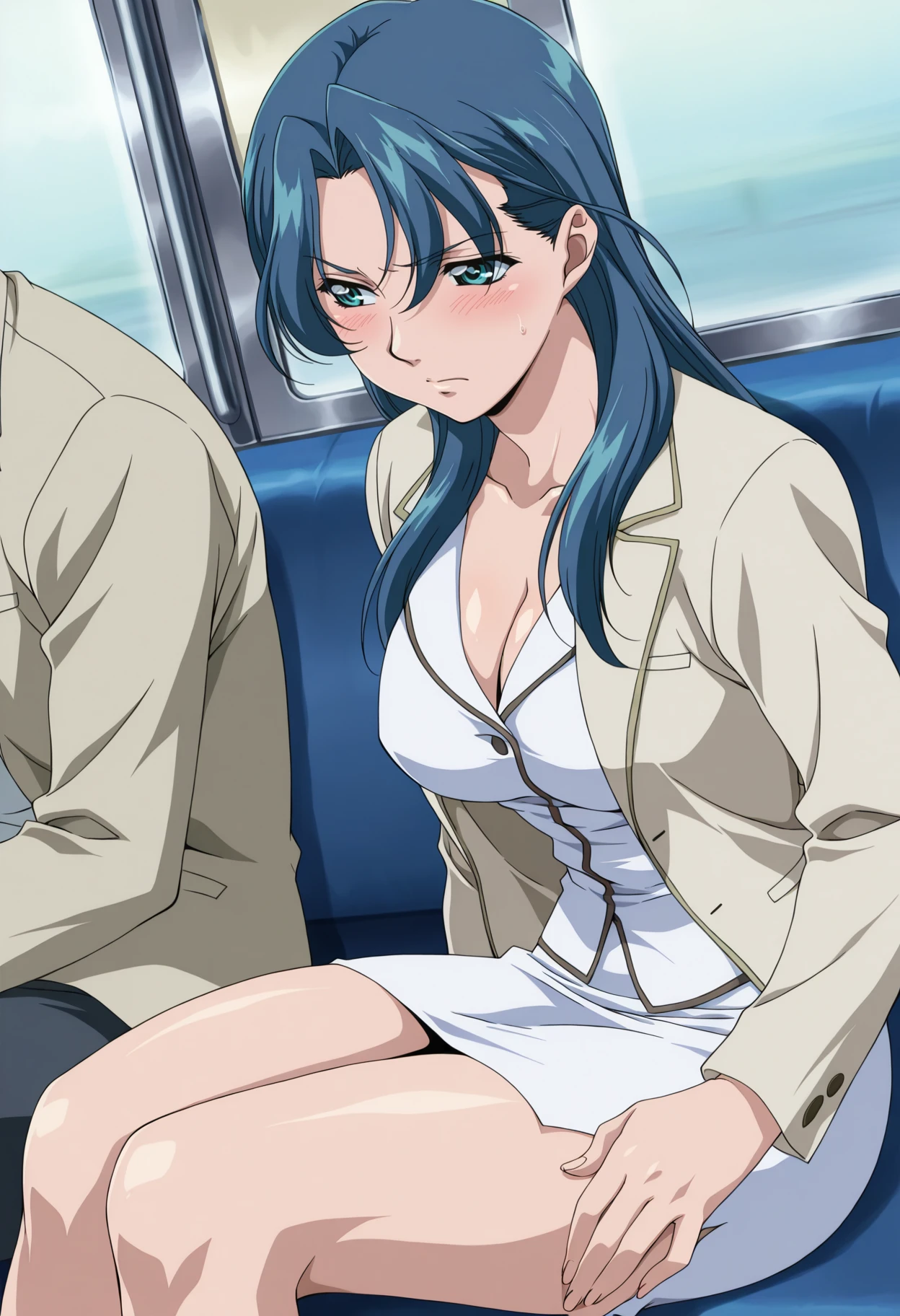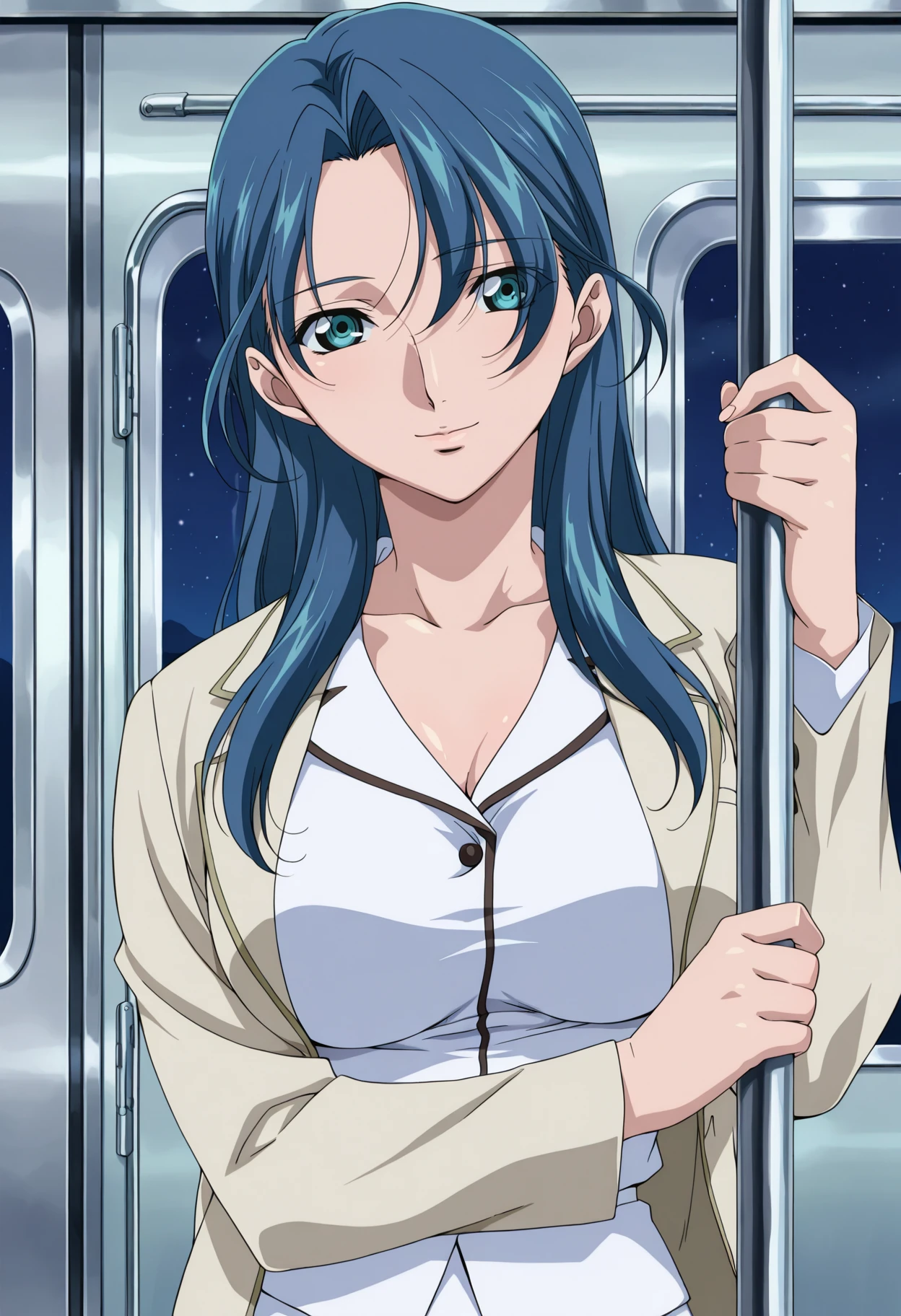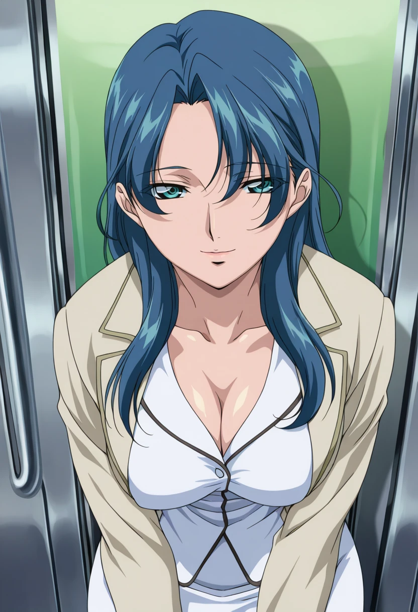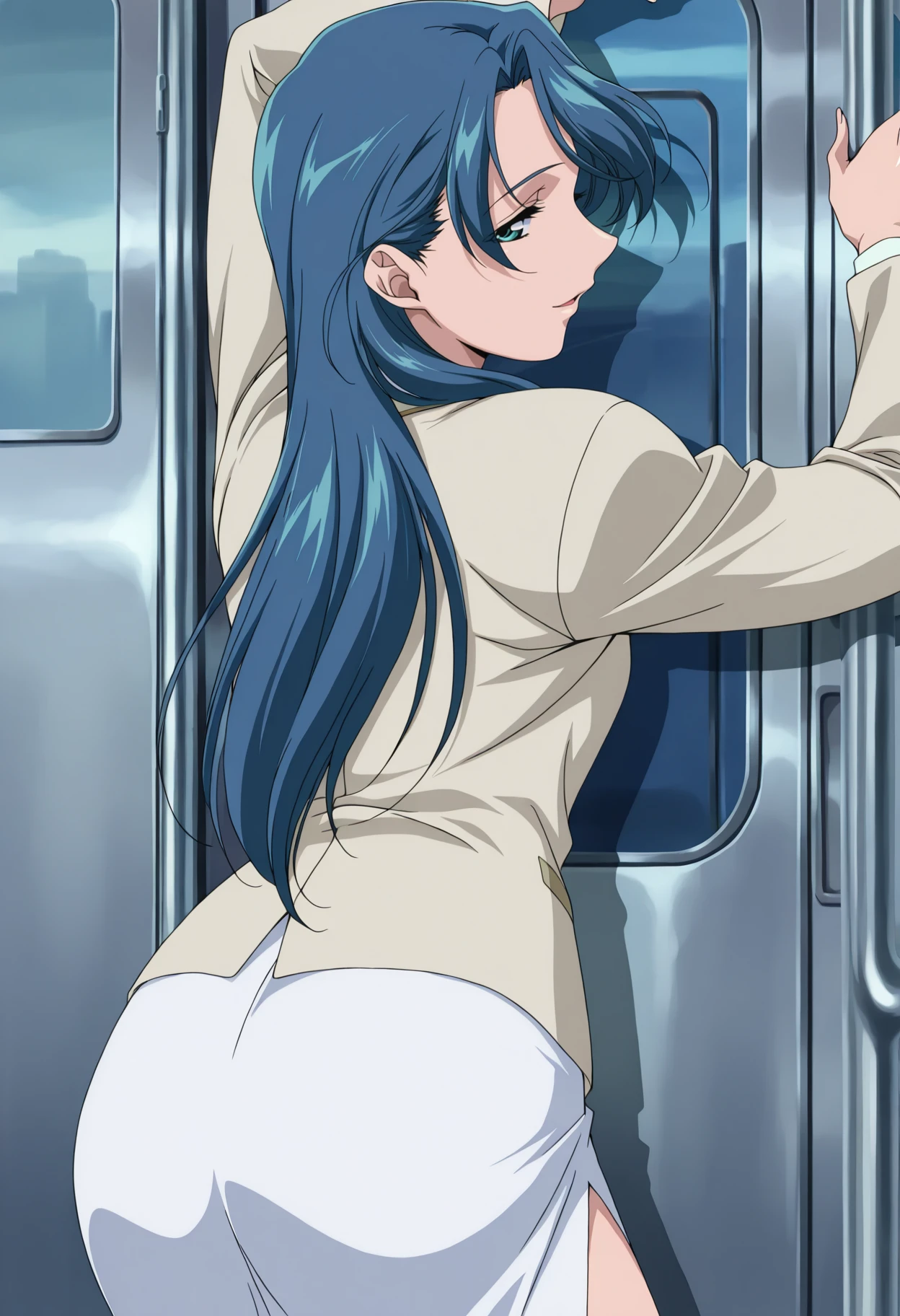 Base: sayaka_i, 1girl, anime coloring, retro artstyle, solo, long hair, blue hair, eyes visible through hair, aqua eyes, sayaka skirt suit, pink jacket, white shirt, long sleeves, pencil skirt, white skirt, open jacket, large breasts,