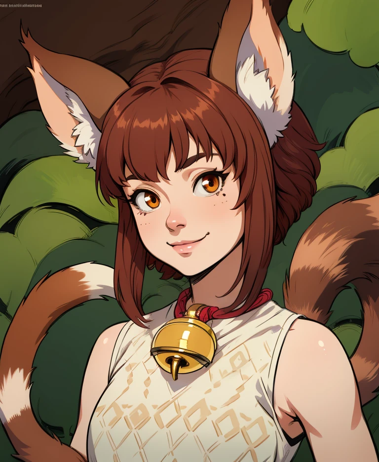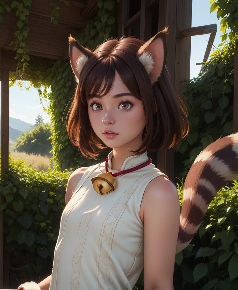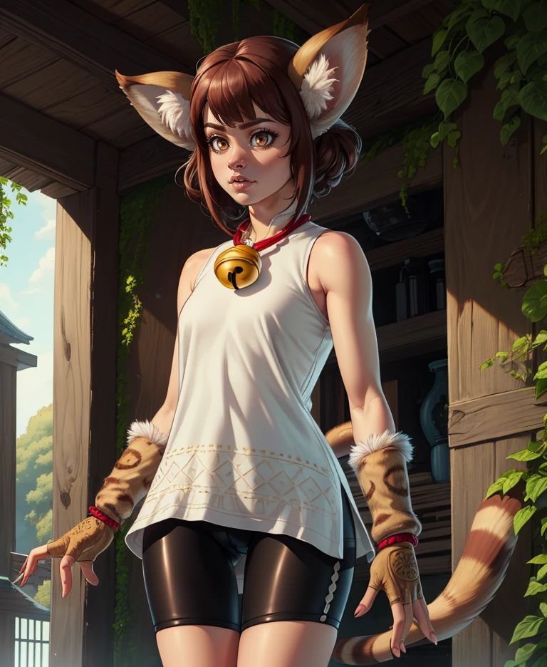 white sleeveless dress with pattern, black bike shorts, neck bell, fur footwear, fur fingerless gloves,